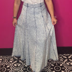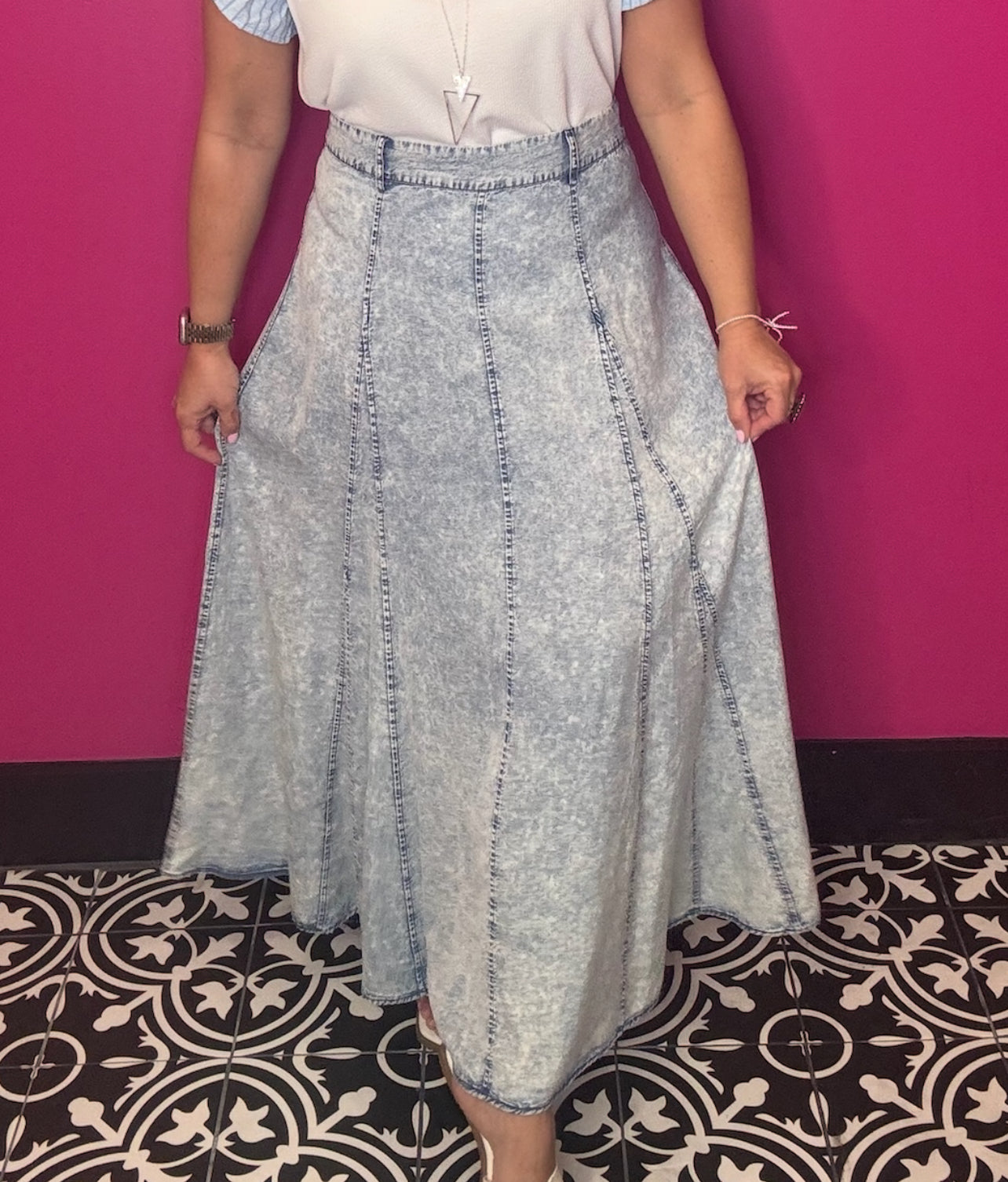 Imagine a denim flare maxi skirt that feels like the perfect mix of casual and stylish. It’s got that classic denim look, but the flare at the bottom adds a touch of drama and flow, making it feel effortless yet chic. The fabric is sturdy but soft, so you can move comfortably, and the length gives it that laid-back, boho vibe. Whether you're pairing it with a tucked-in tee or a breezy blouse, it's the kind of skirt that instantly makes you feel like you’re ready for a fun, easygoing day out.