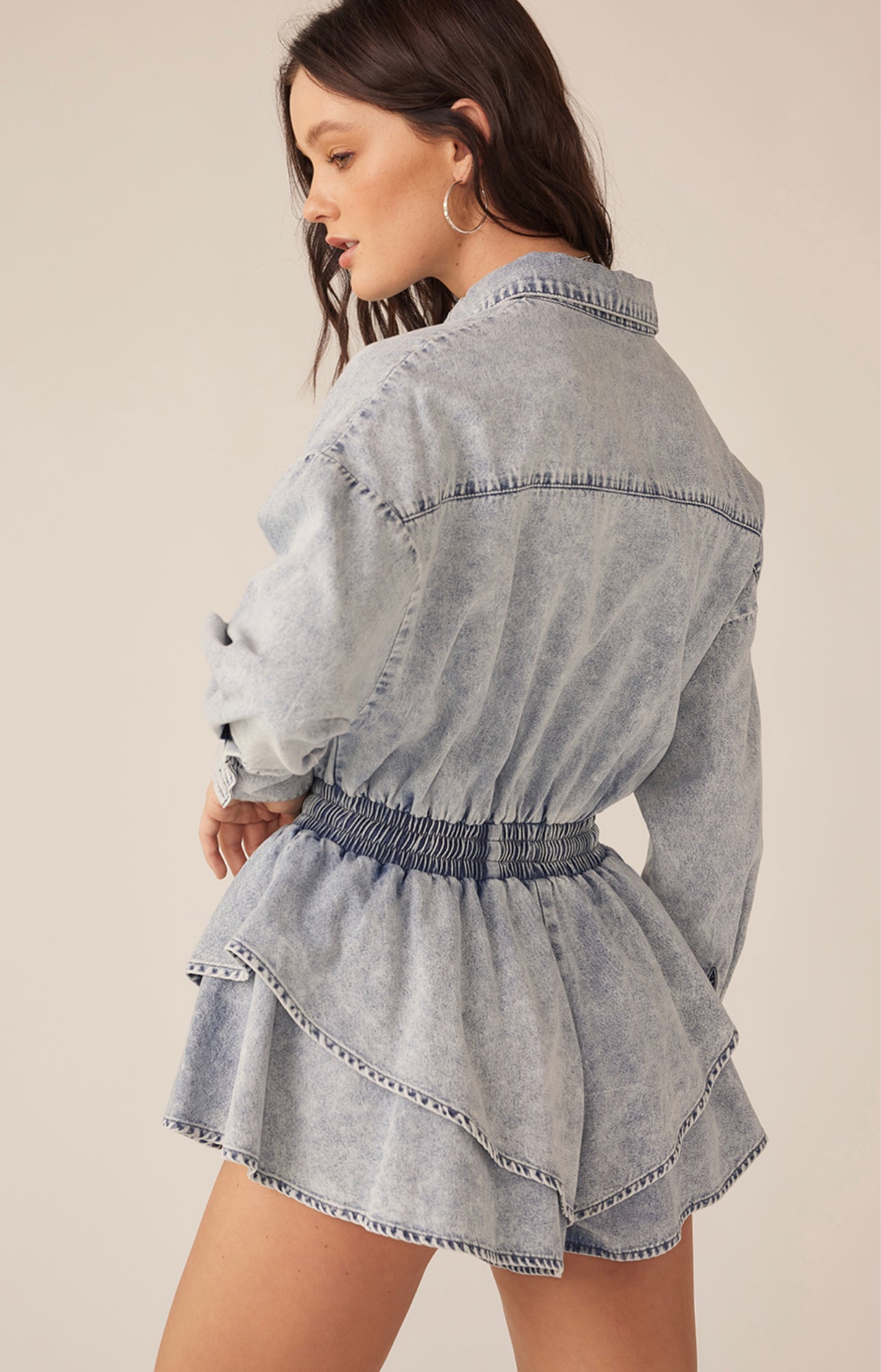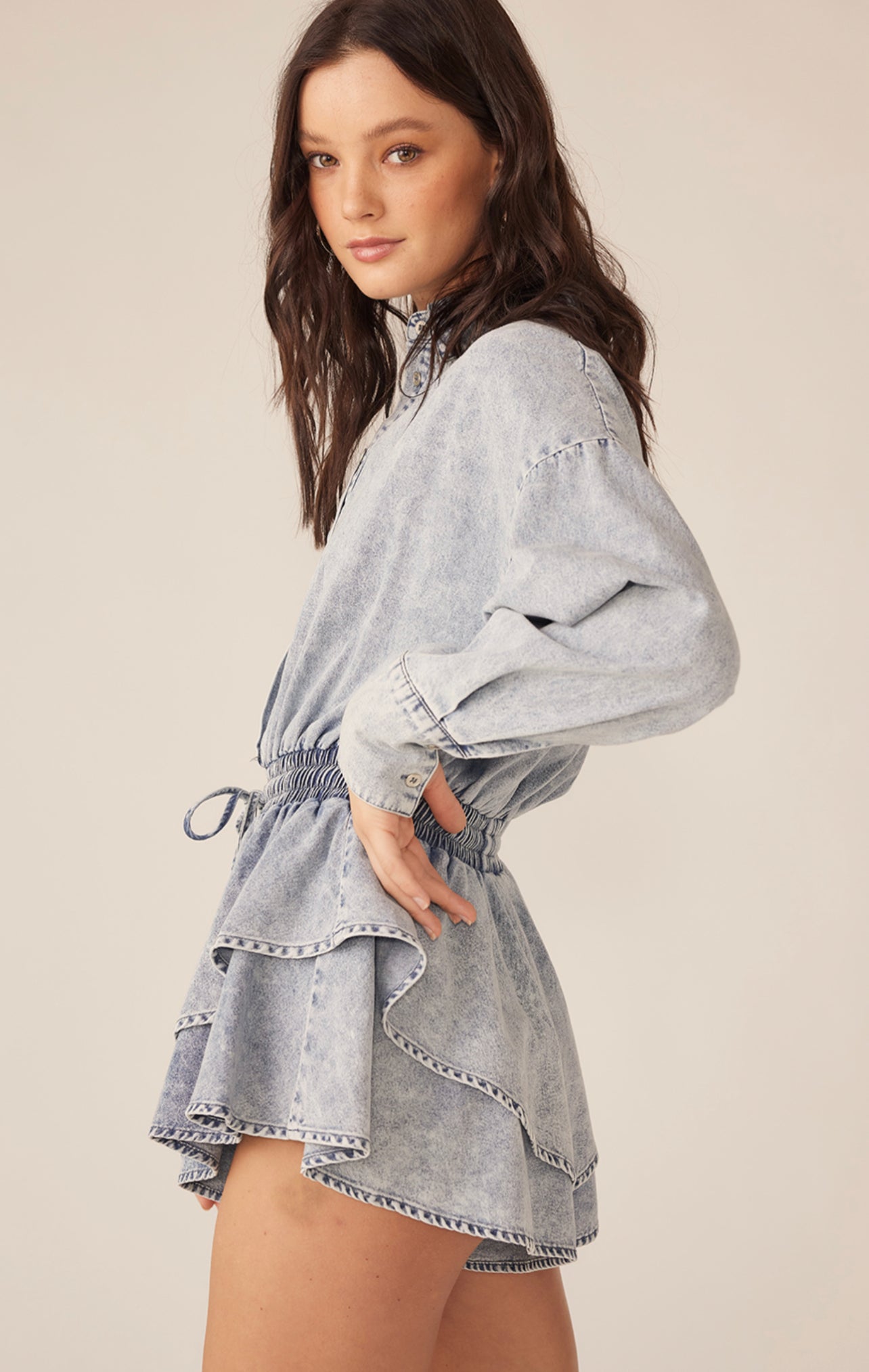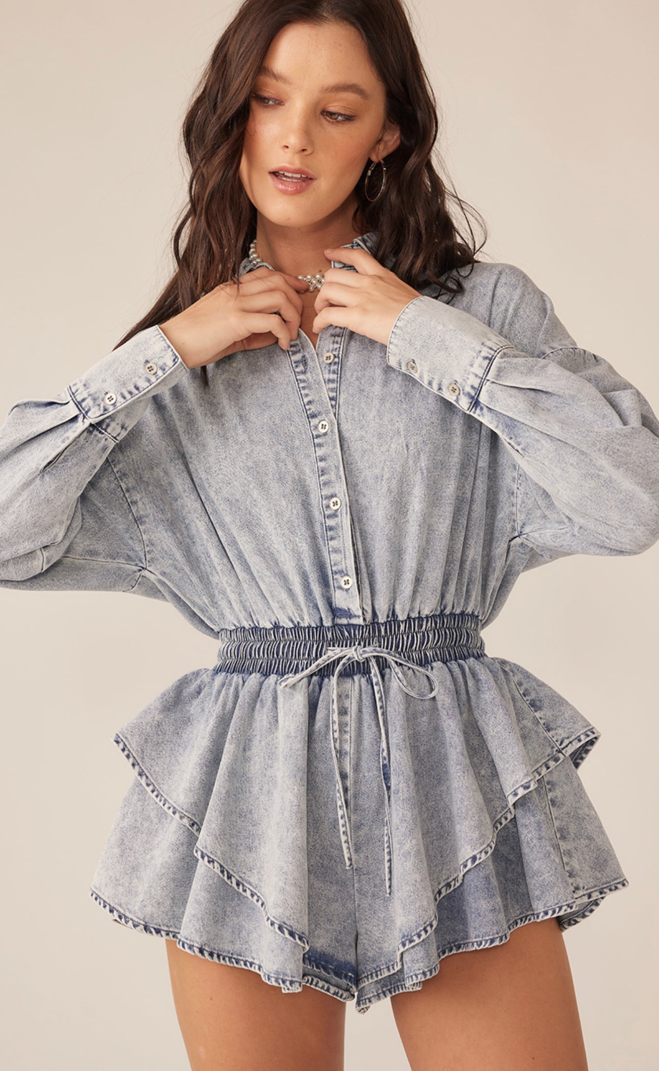 This long sleeve button up romper has and elastic waist with a drawstring. The tiered skirt is ruffled for extra fullness.