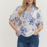 Floral print short dolman sleeve woven top featuring contrast striped band collar V-neck. Elasticated sleeve openings. Unlined. Woven. Non-sheer. Lightweight.