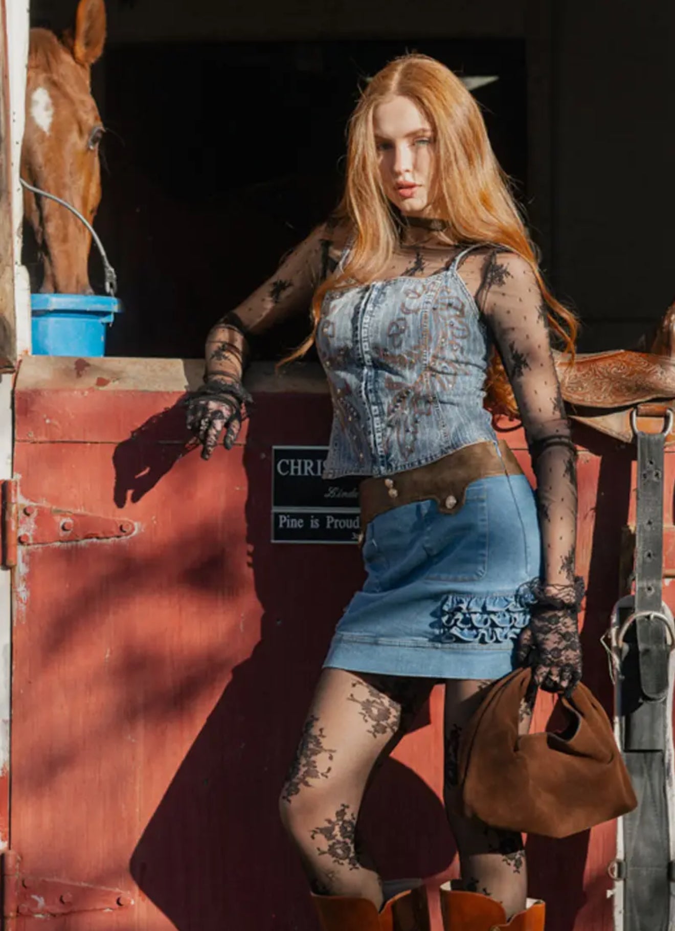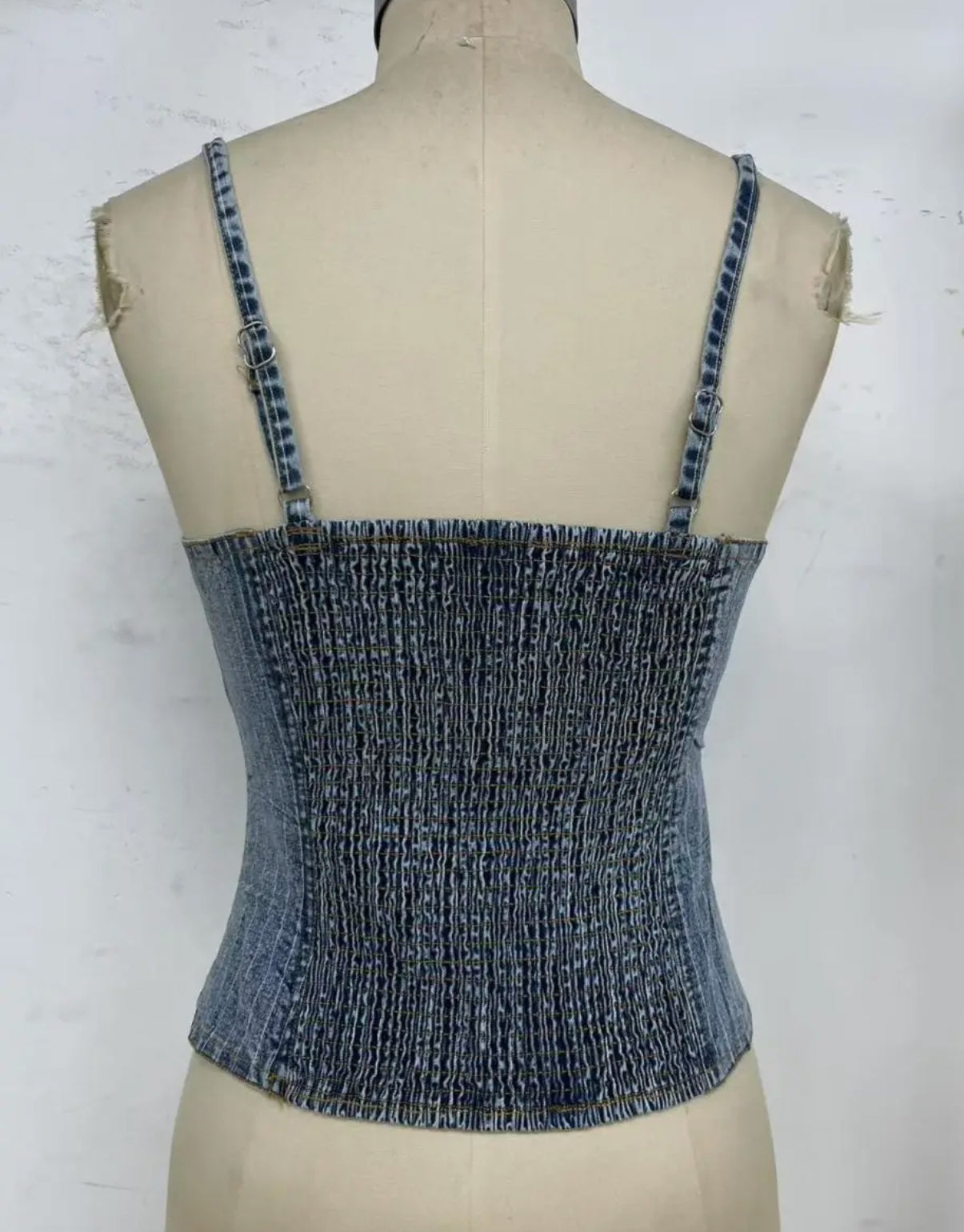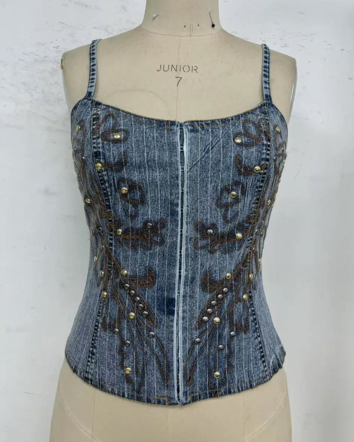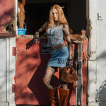 Turn heads in our Wild West Denim Corset Top, a perfect blend of edgy western charm and flattering feminine style. Crafted from premium denim, this structured corset features intricate embroidery and stud detailing for a bold, statement look.
