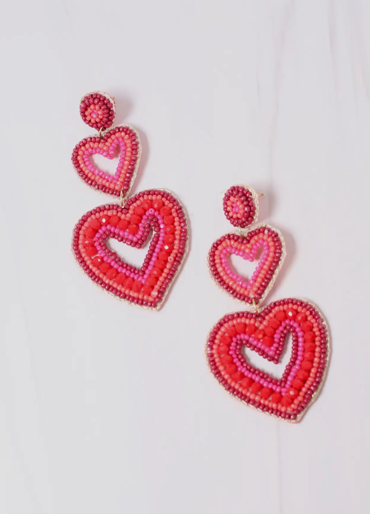 Show how much you love, Love with these charming double heart earrings! It has two open heart drops with shades of red beading. It has a matching beaded post and is felt covered on the back.