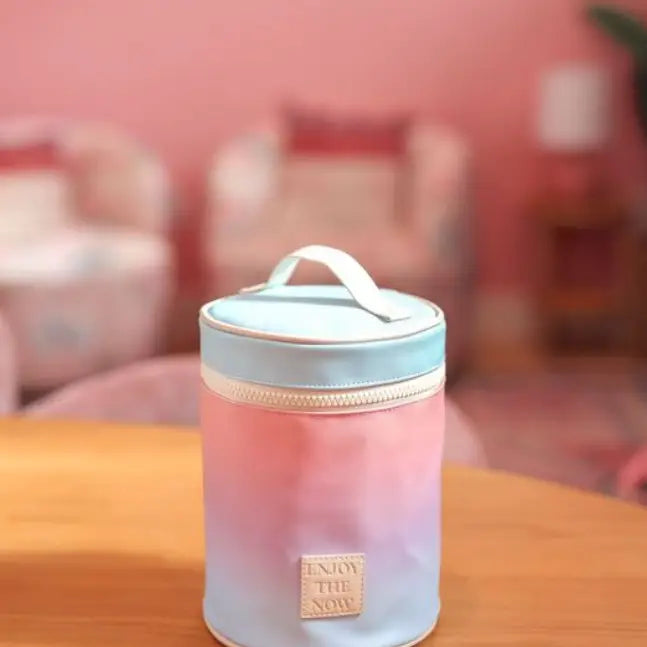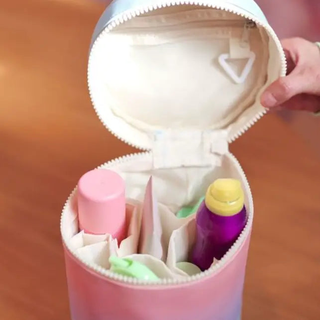 This stylish, spacious cosmetic bag is a game-changer for anyone who loves to stay organized on the go! At 9 14" tall and 7 1/4" in diameter, it offers plenty of room without feeling bulky. Made from durable PU leather on the outside, it has a sleek, sophisticated look, while the soft polyester lining keeps everything safe inside. The nearly 360-degree zipper gives easy access to all your beauty essentials, and the top features a fully mesh pocket with a zipper and a cute triangular keyring for added flair. Inside, you’ll find six pencil pie pockets—perfect for liners or brushes—and a removable pocket divider that can hold up to 7 cosmetic bottles. It’s the perfect combination of practical and stylish for beauty lovers!