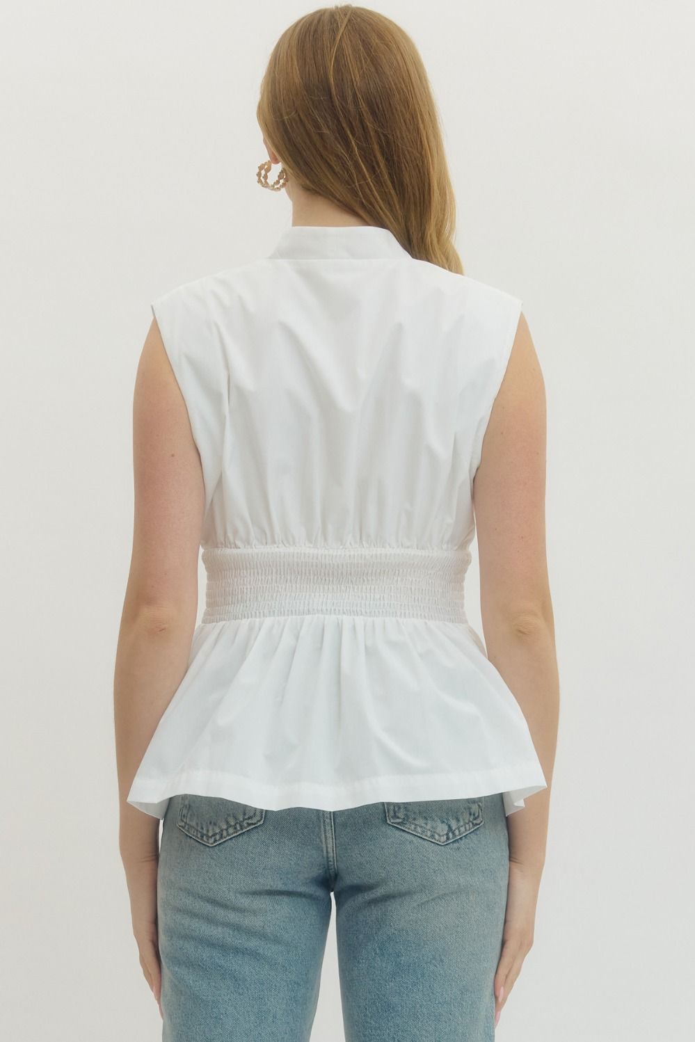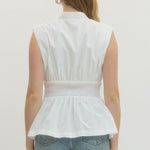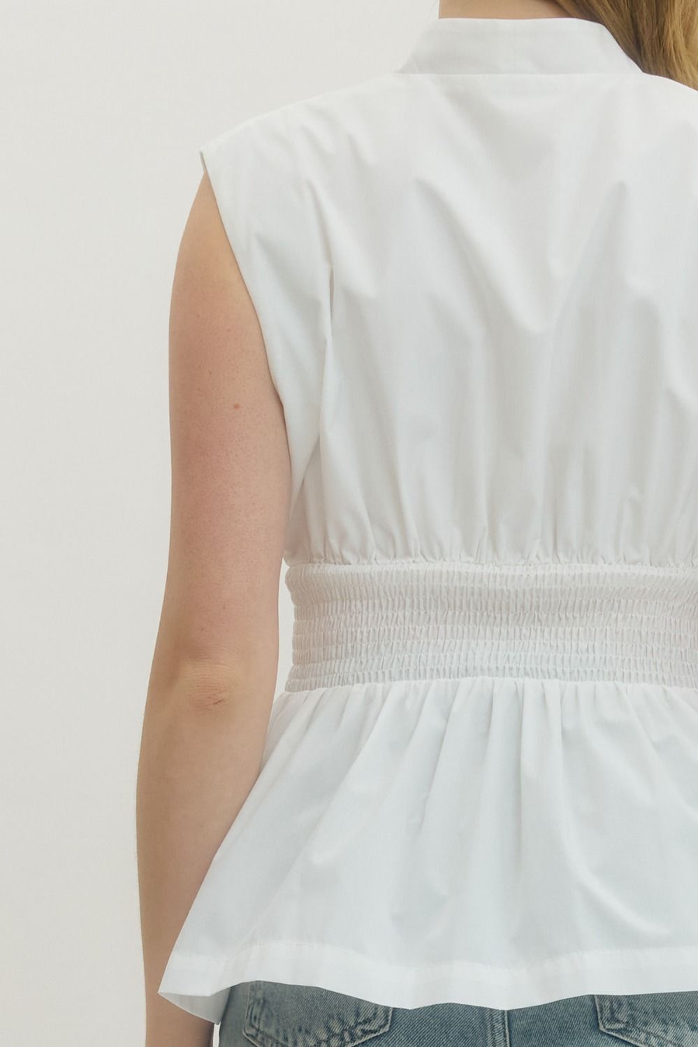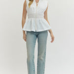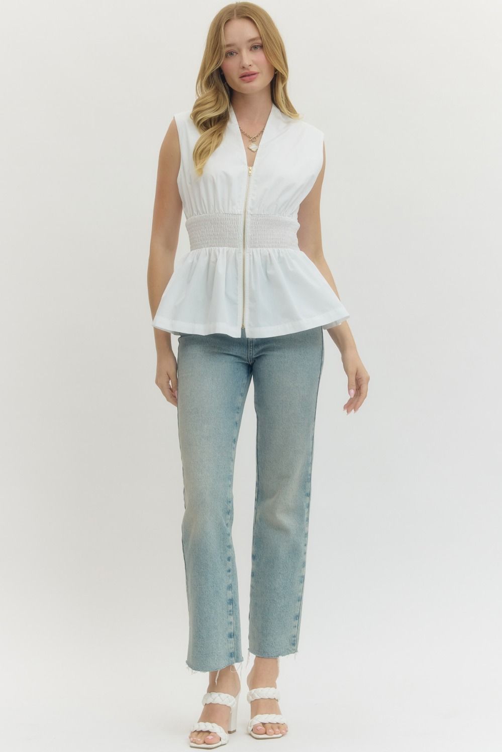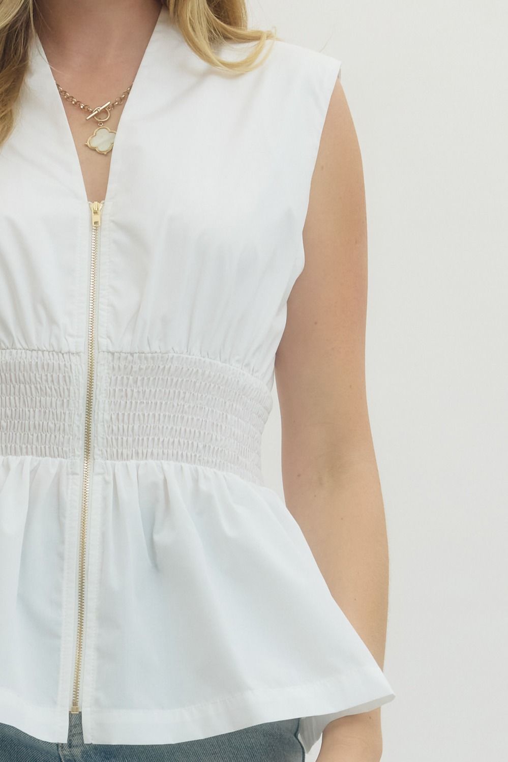 Meet your new go-to top for effortless polish. The Everyday Zip Peplum Top features a flattering smocked waist that defines your shape while the soft peplum hem adds just the right amount of feminine flow. Designed with a sleek zip-front detail and a clean sleeveless silhouette, this top transitions seamlessly from casual denim days to dressed-up evenings.