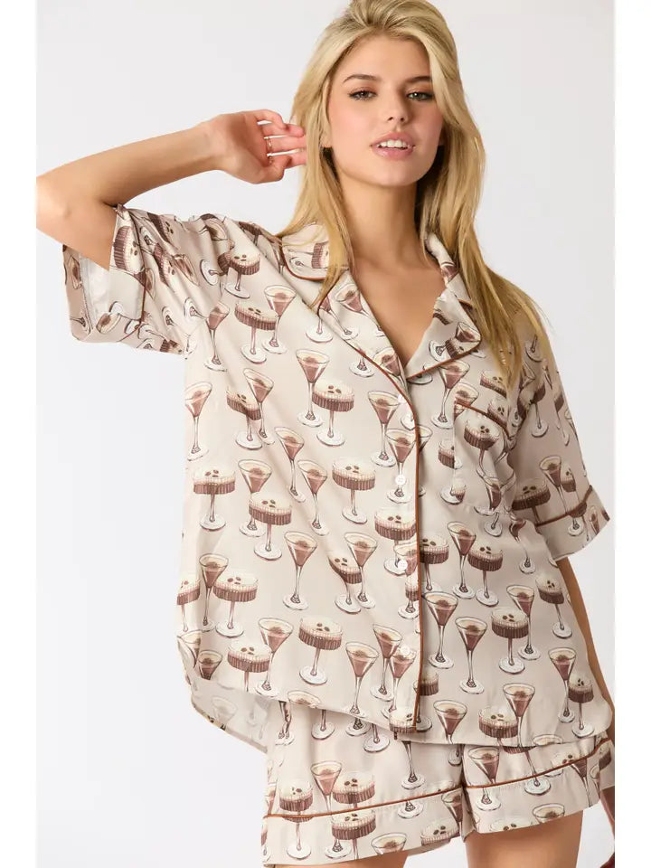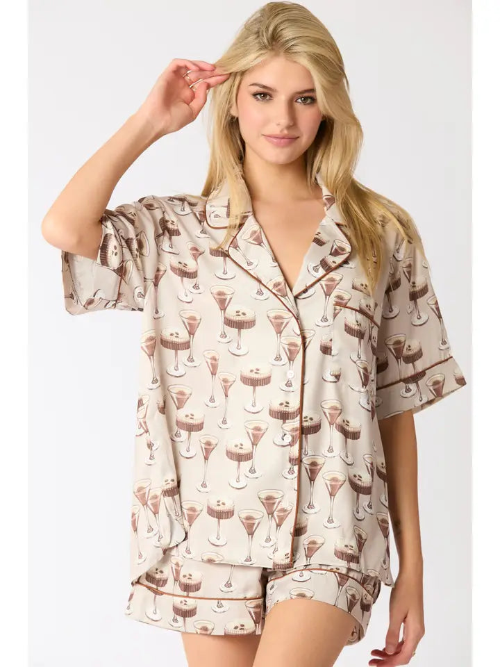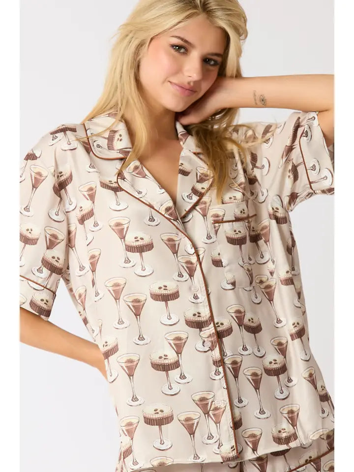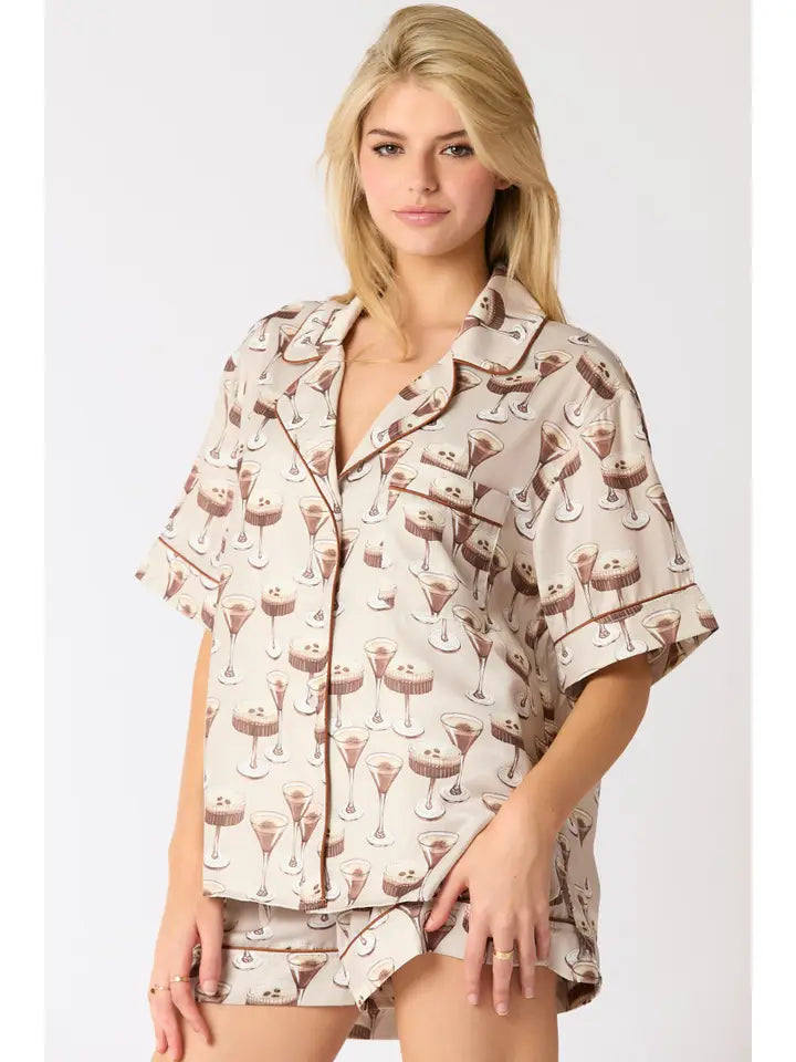 This pajama set is crafted from luxurious poly satin fabric, offering a smooth and silky feel that enhances comfort during relaxation or sleep. The fabric's lightweight nature ensures breathability, making it suitable for various climates and seasons. Featuring a playful espresso martini print throughout, this pajama shirt exudes charm and personality. The espresso martini motif adds a whimsical and fun element to the design, perfect for adding a bit of flair to your loungewear collection.
