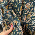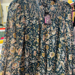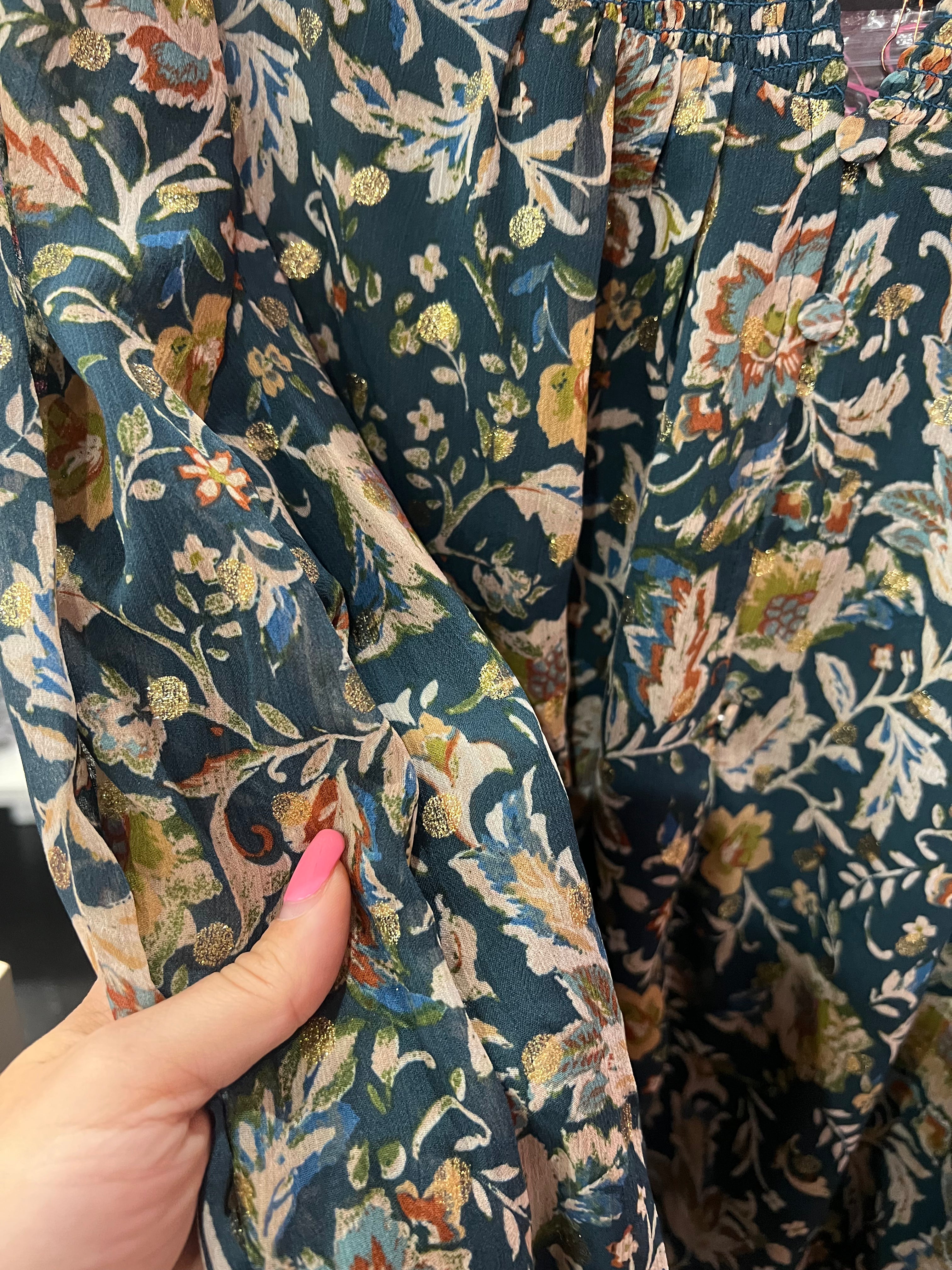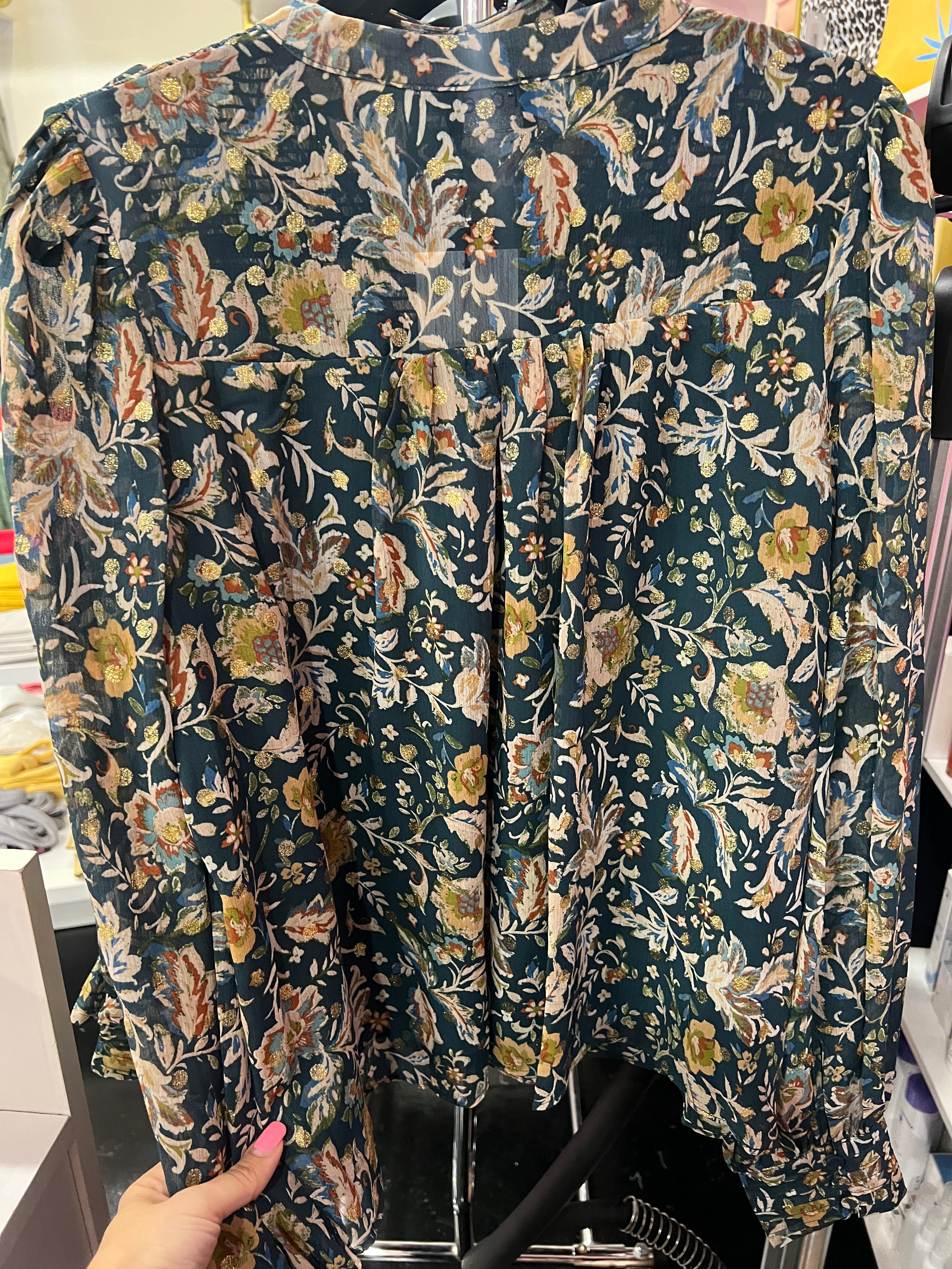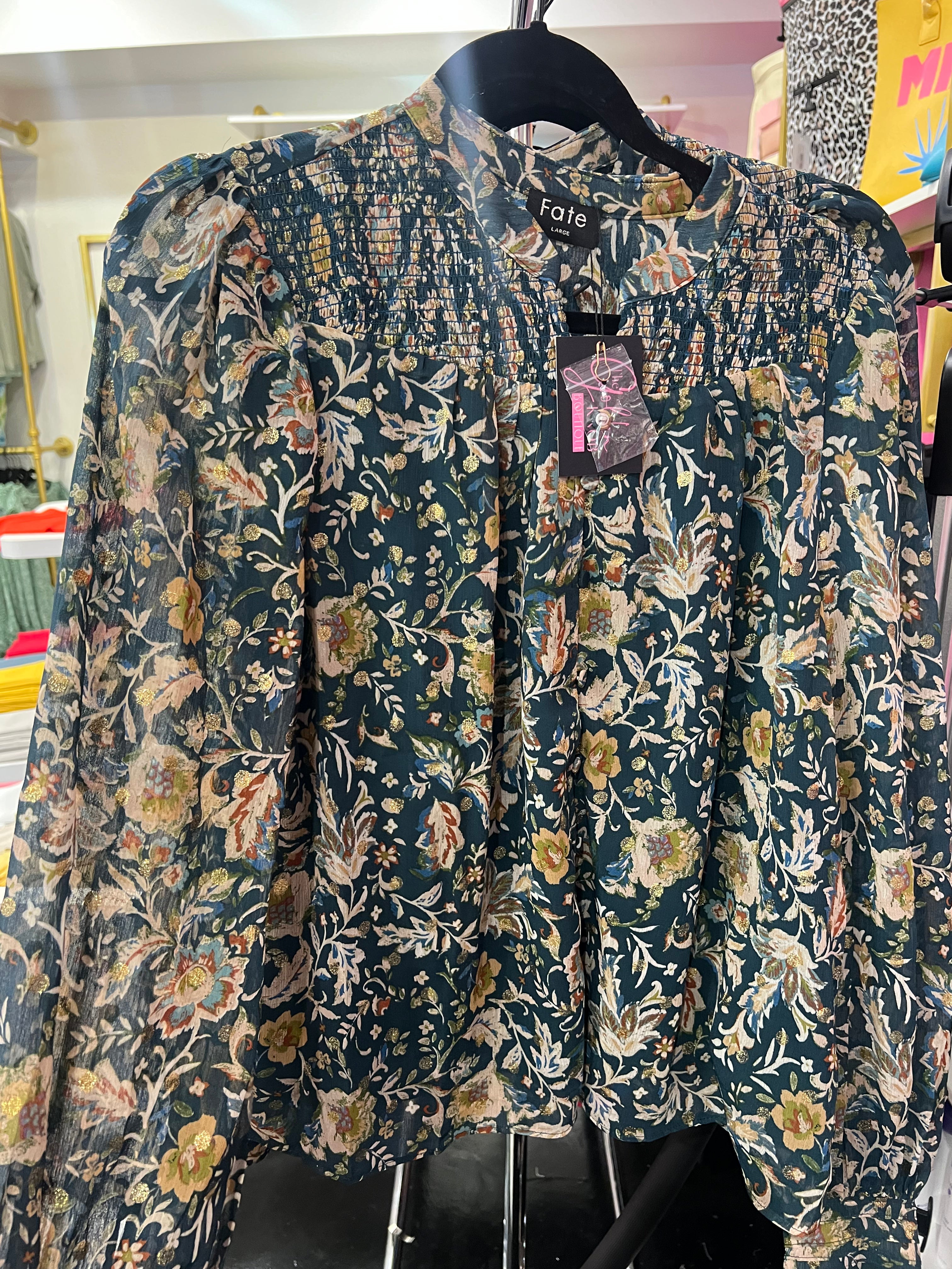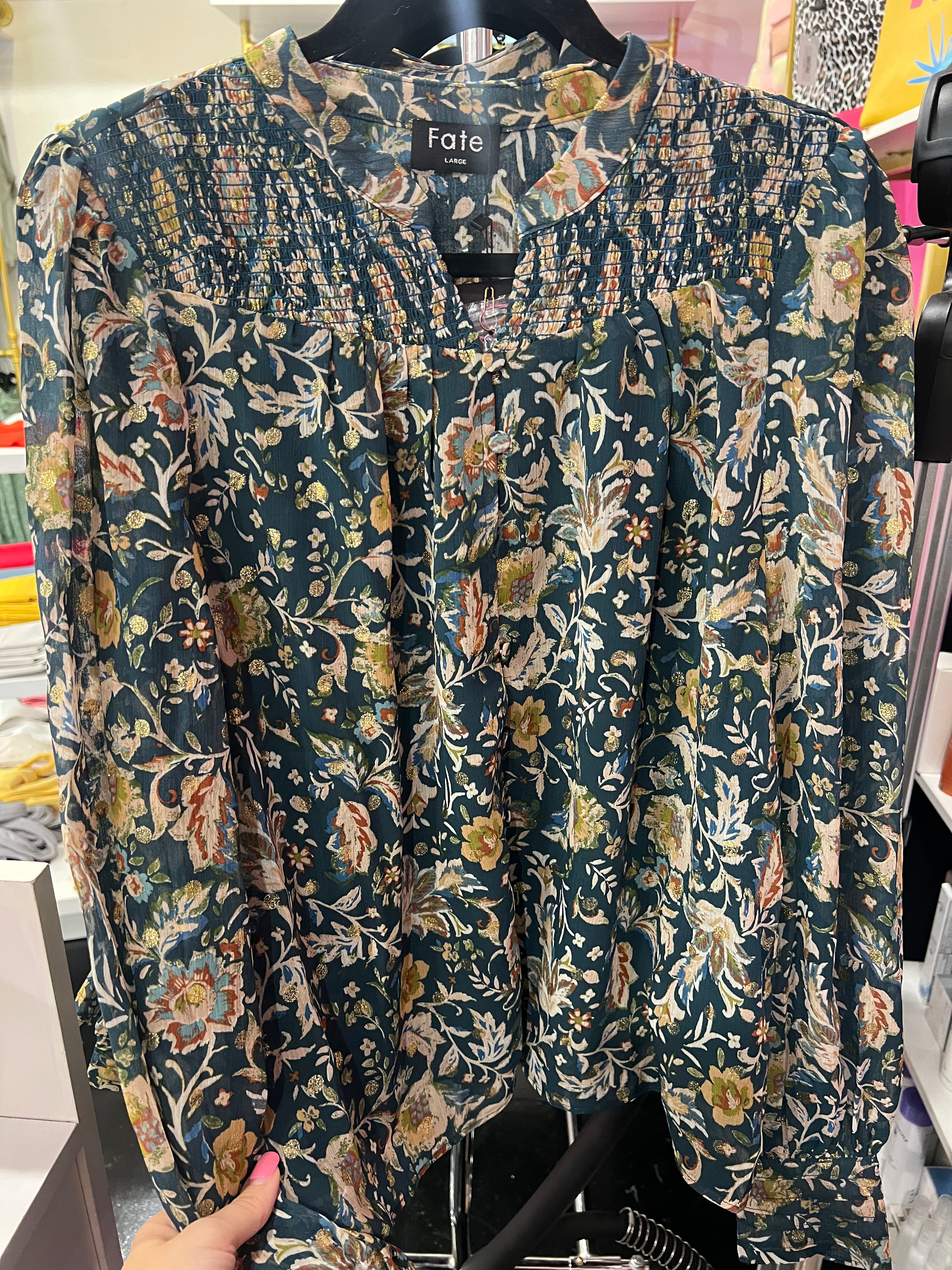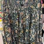 Beautiful Teal Green Multi Top with gold glitter. Smocked blouse with floral print.