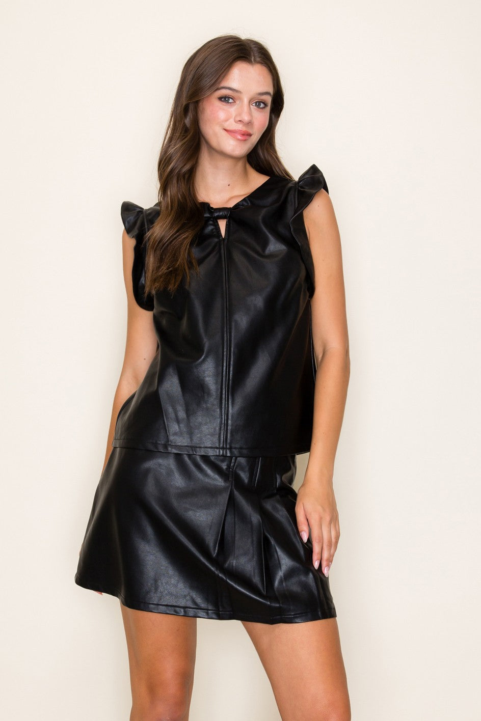 Edgy meets feminine in this chic faux leather top. Designed with delicate ruffle sleeves and a subtle keyhole neckline, this piece brings a modern twist to a timeless silhouette. The buttery-soft faux leather finish adds just the right amount of boldness while still keeping it versatile for day-to-night styling.