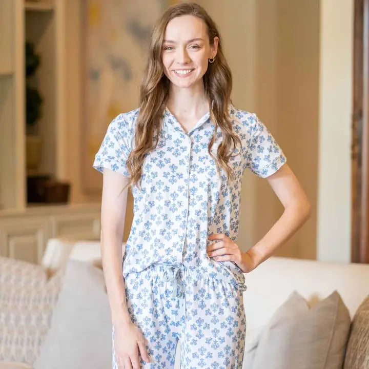 Picture this: a soft, silky button-up sleep top decorated with delicate Fleur de Lis prints. It’s the kind of piece that feels like a hug from your sheets, but with a touch of elegance. The floral-inspired pattern adds just enough flair, while the smooth fabric glides over your skin, making every moment of winding down feel a little extra special. Perfect for cozy nights, but still so stylish you could totally wear it around the house during the day too. Pair with our matching sleep pants!