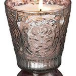 Dainty silvered glass, with an embossed fleur de lys on a pedestal base offered in several colors.