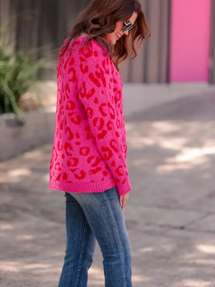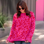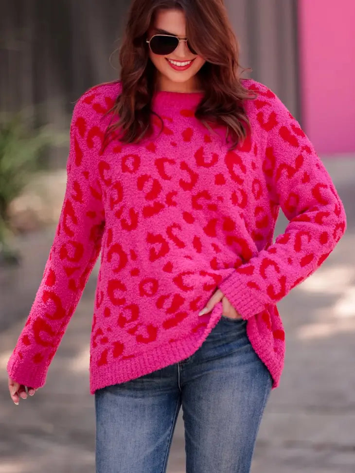 Flirty and Fun this fuzzy sweater is the softest! Slip into coziness with this adorable leopard print sweater! The soft material, rounded neckline, and fun pink leopard print make for one amazing sweater! Fabric: Size Small fits size 2-4 Size Medium fits size 6-8 Size Large fits size 10-12