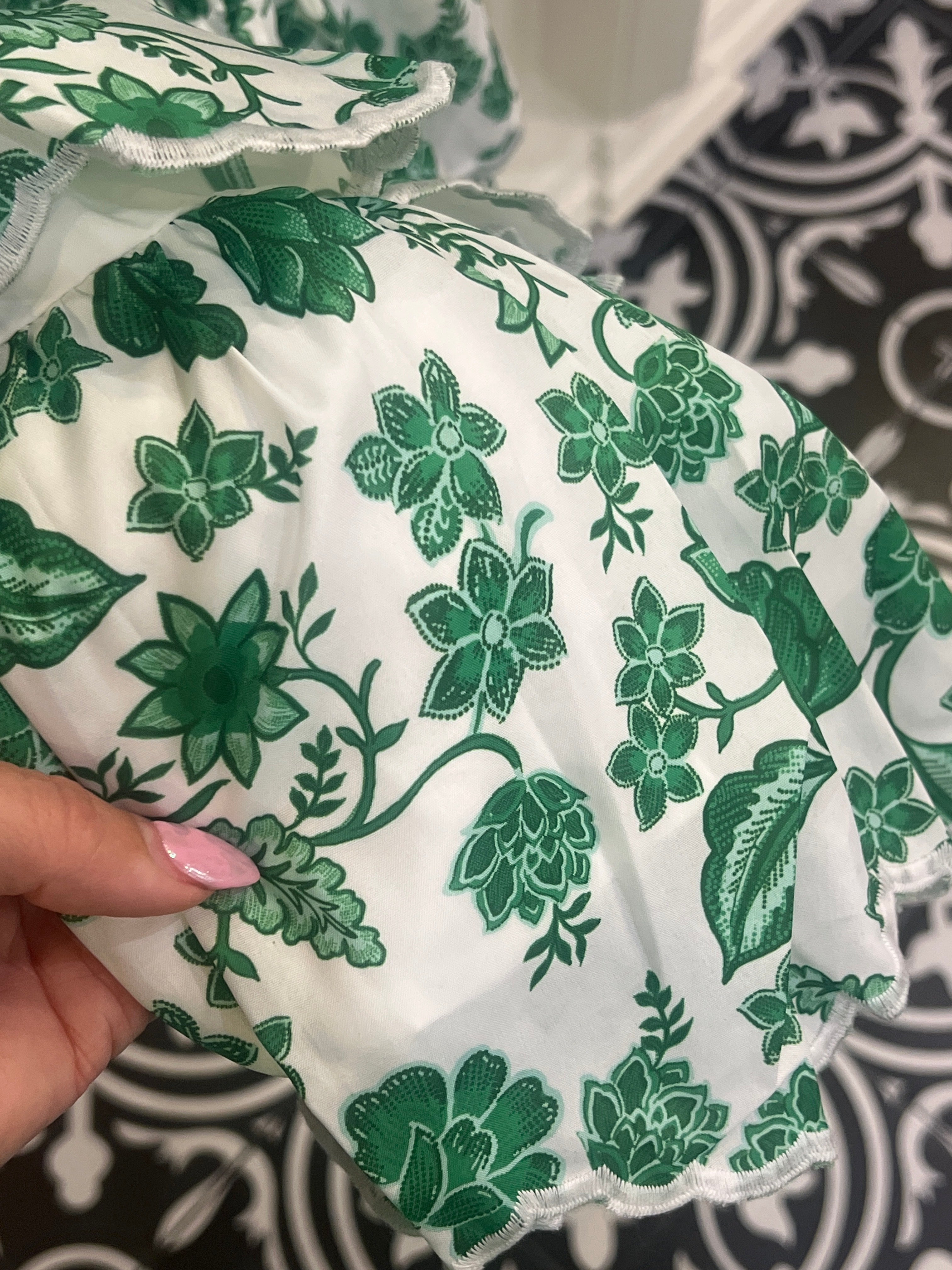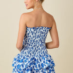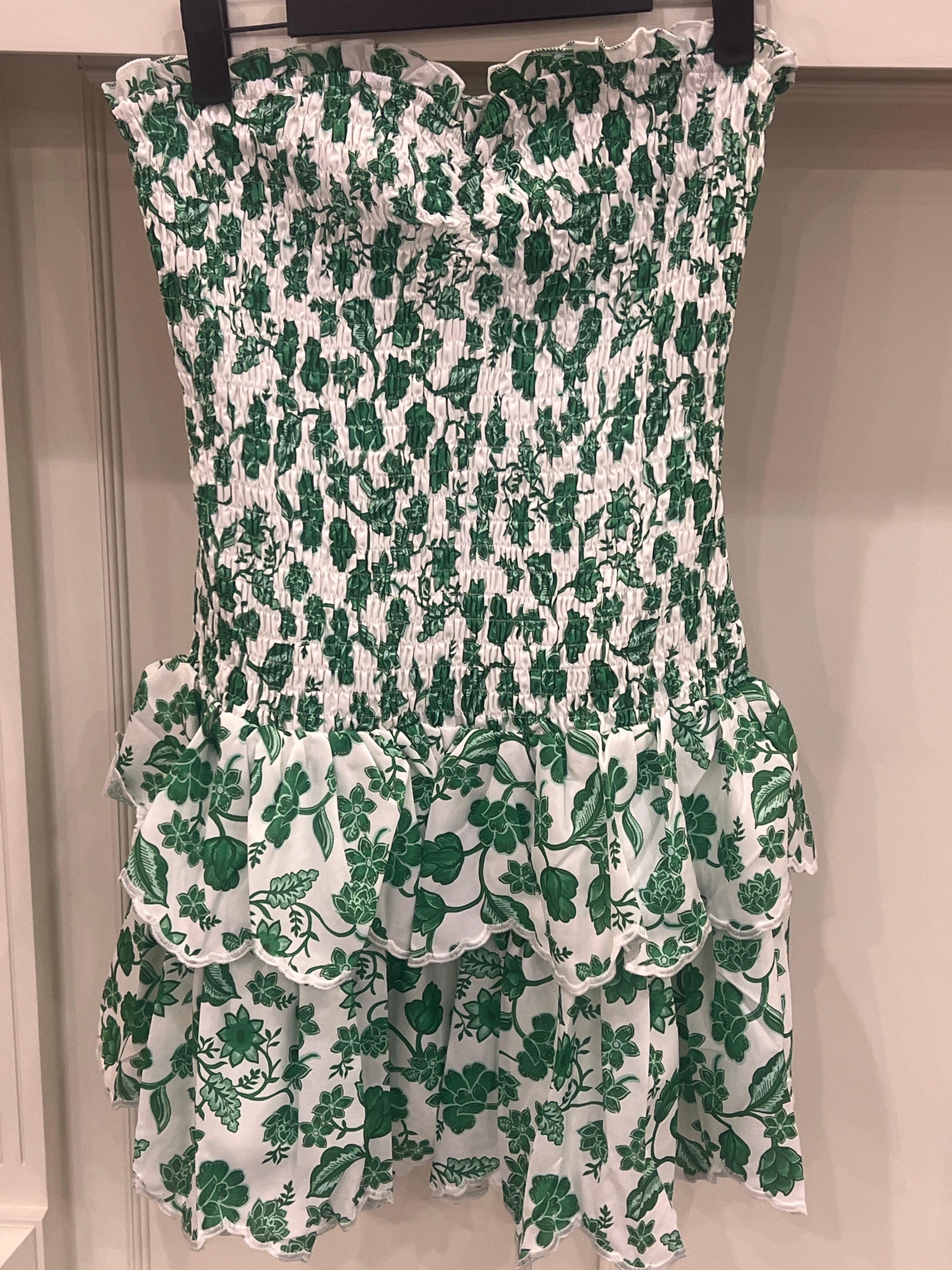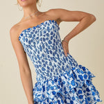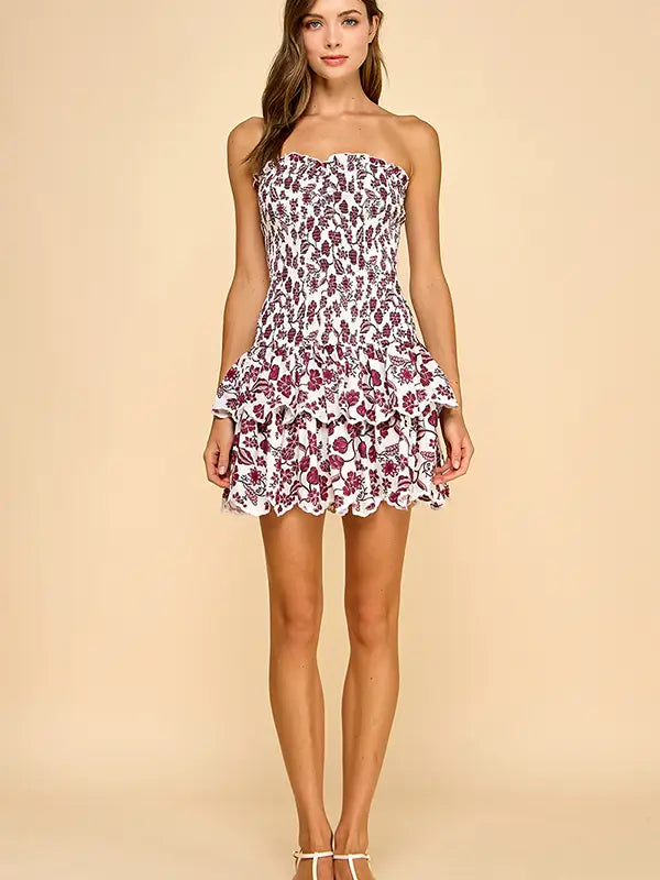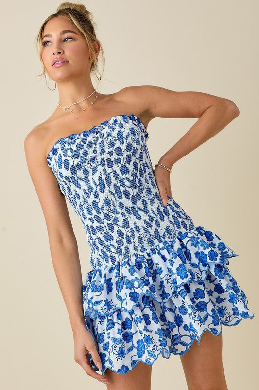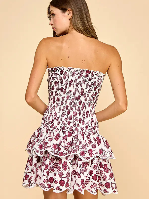 This dress is the perfect balance of sophistication and playful charm! The ruffled neckline adds a flirty touch, while the strapless style gives it that chic, feminine vibe. The low hip smocked bodice not only gives you a snug, flattering fit but also adds a comfy, stretchy feel that moves with you. The embroidered hem is a delicate, eye-catching detail that elevates the whole look. Made with exclusive printed fabric, this fit-and-flare dress is versatile enough to wear from brunch with friends to a casual evening out. It’s comfy, stylish, and perfect for any occasion!