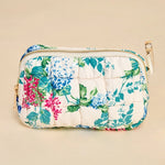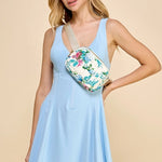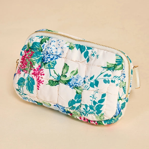 This stylish floral belt bag seamlessly merges fashion and functionality. This bad offers a vibrant floral pattern featuring blues and greens that standout against the light pink of the bag!