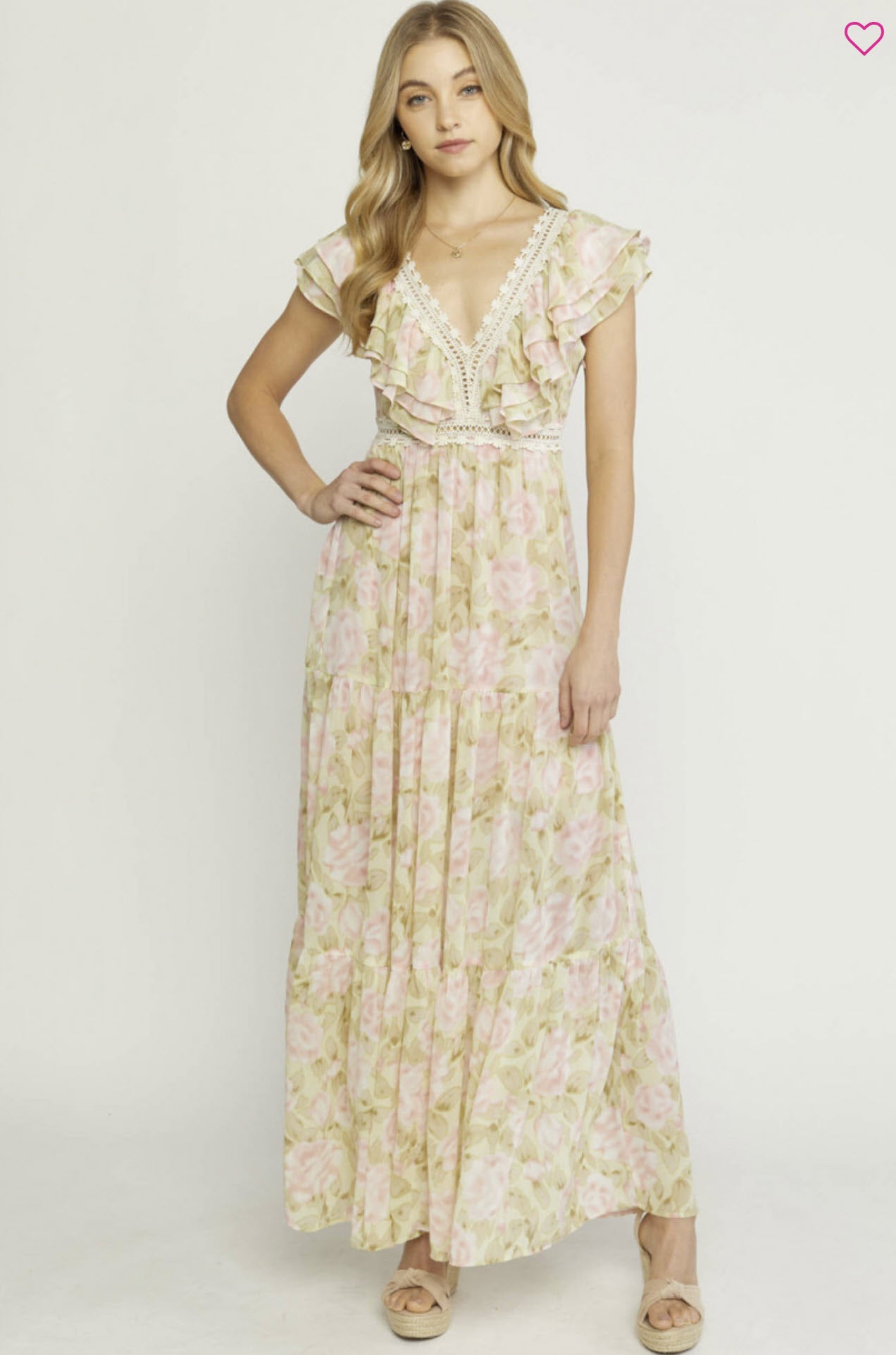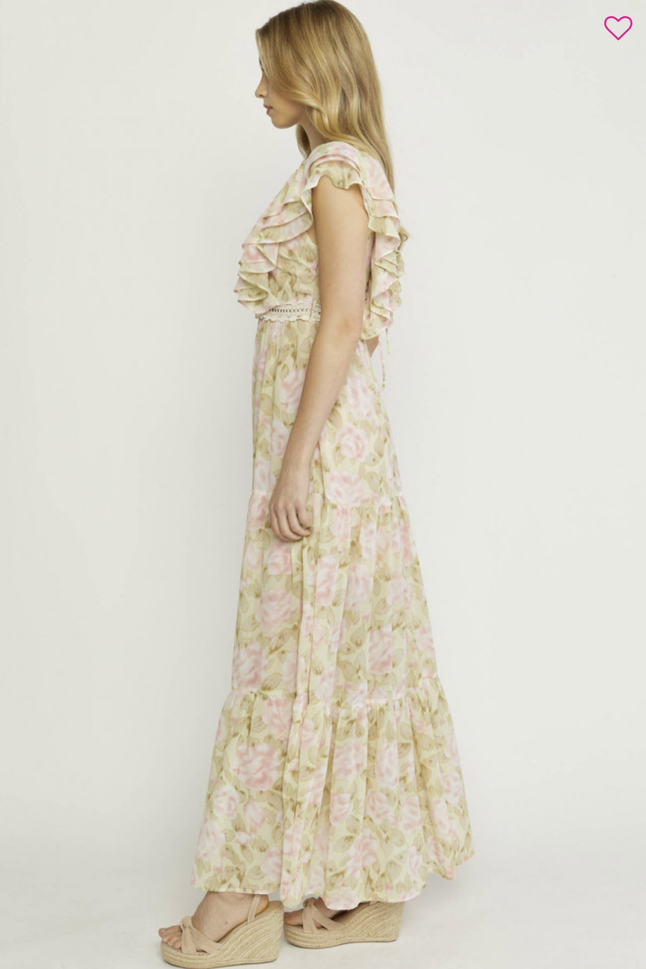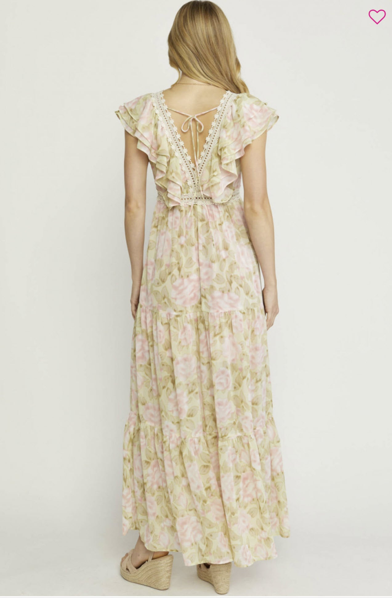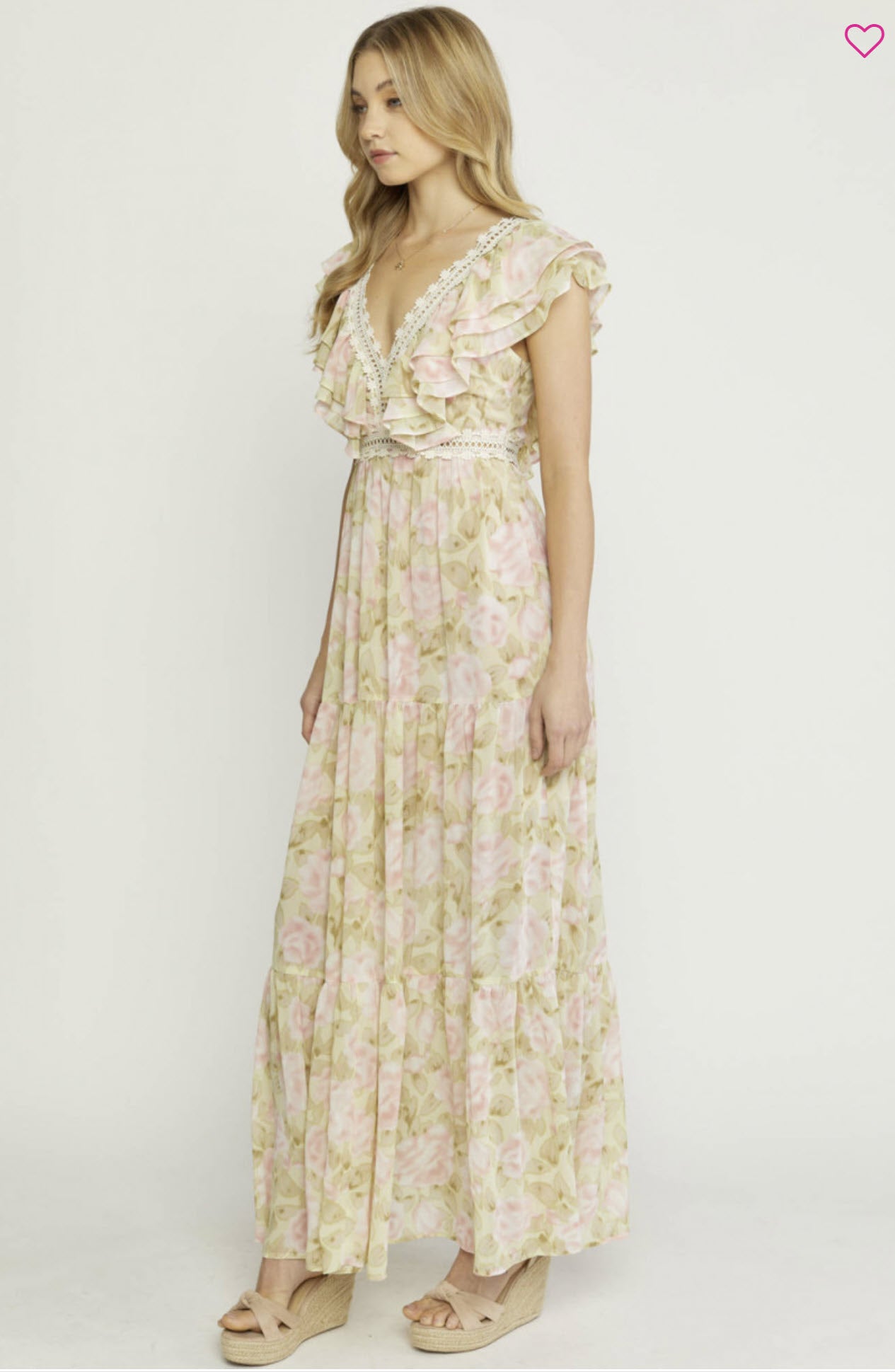 Floral print v-neck tiered maxi dress featuring crochet lace detail. Self-tie closure detail at back. Lined. Semi-sheer. Woven. Lightweight.