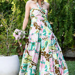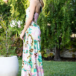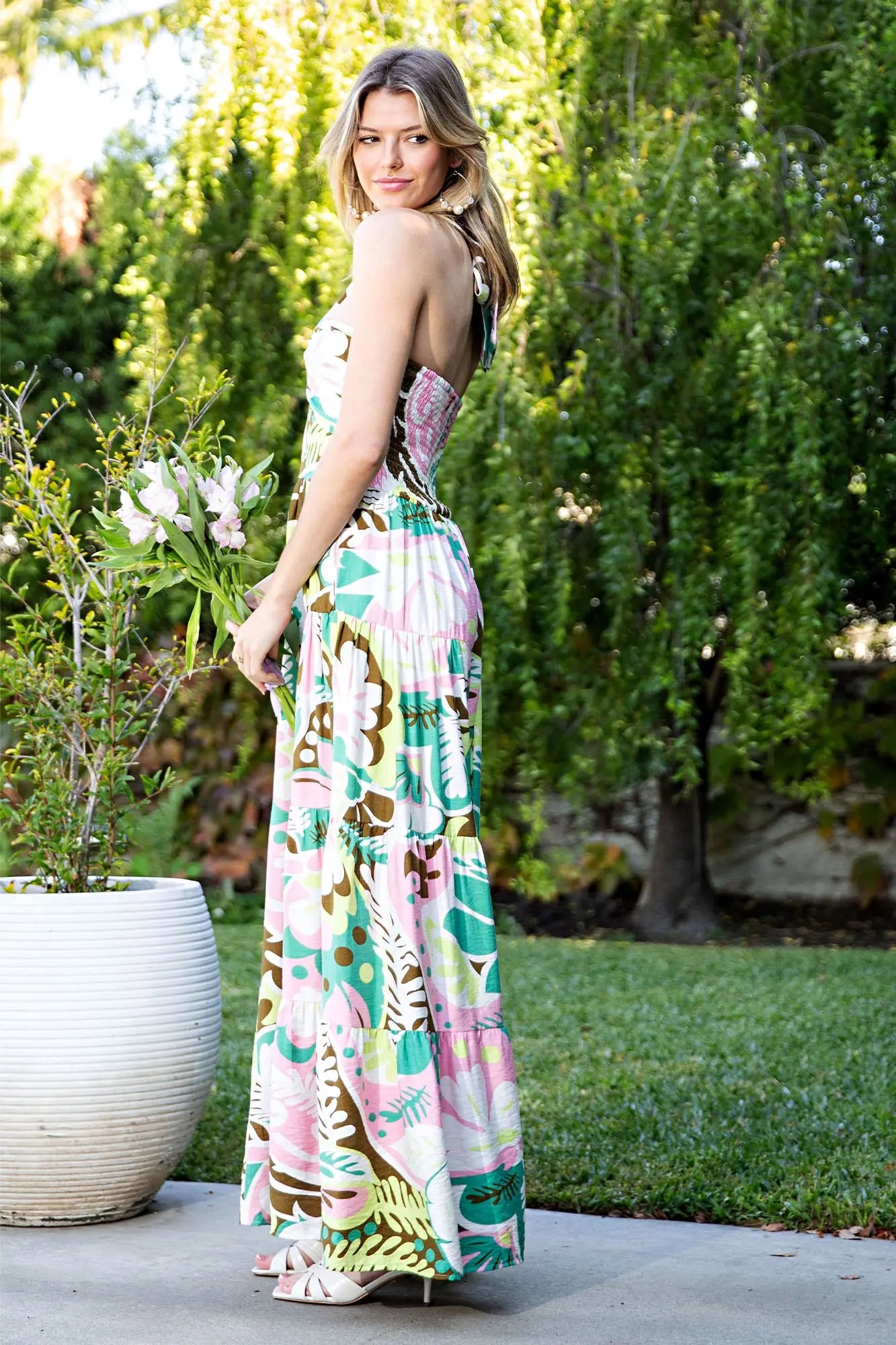 This vibrant printed jumpsuit features a twist front halter neckline that ties at the back, a smocked back panel for a comfortable fit, side pockets, and wide tiered legs that create a breezy, statement making silhouette.