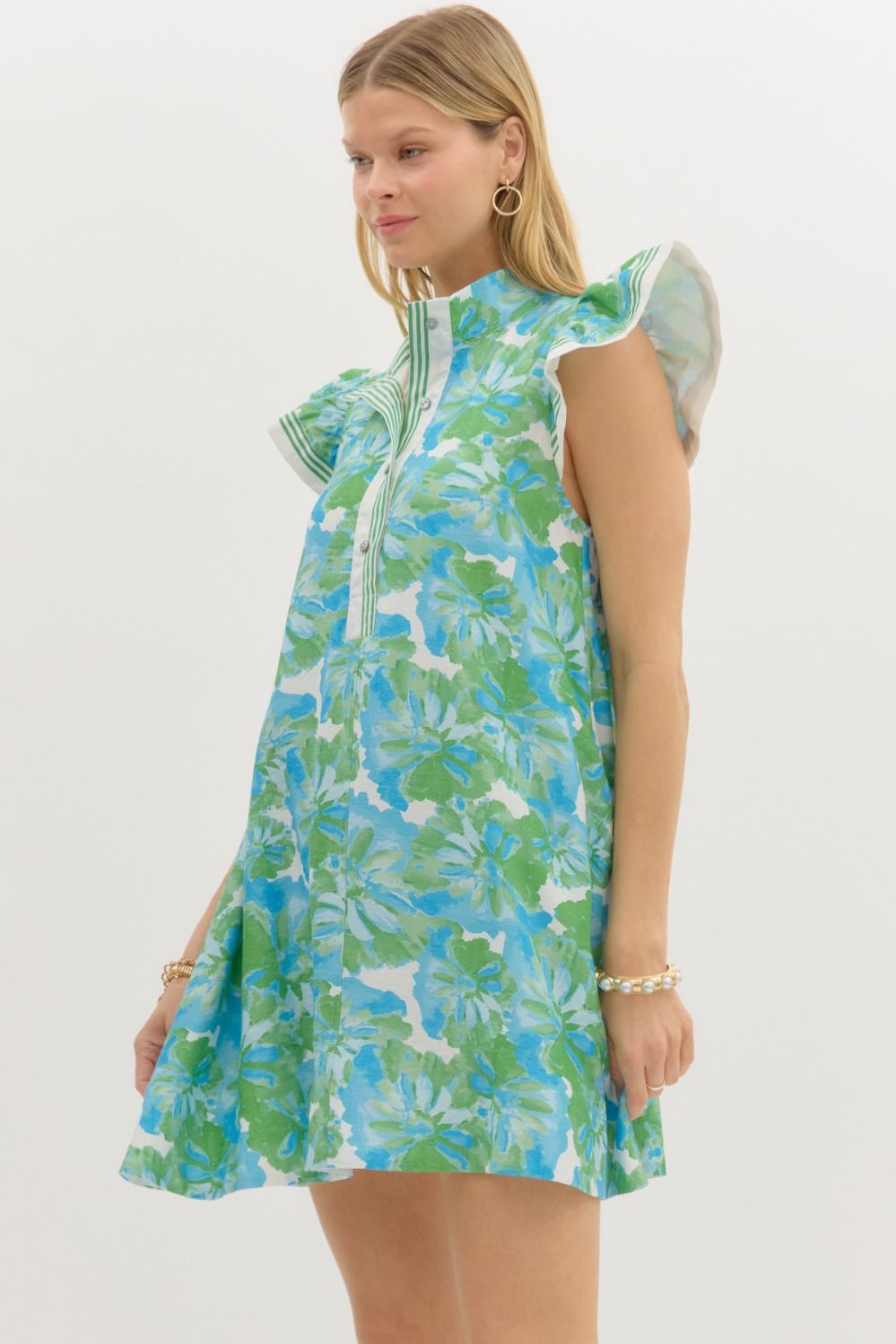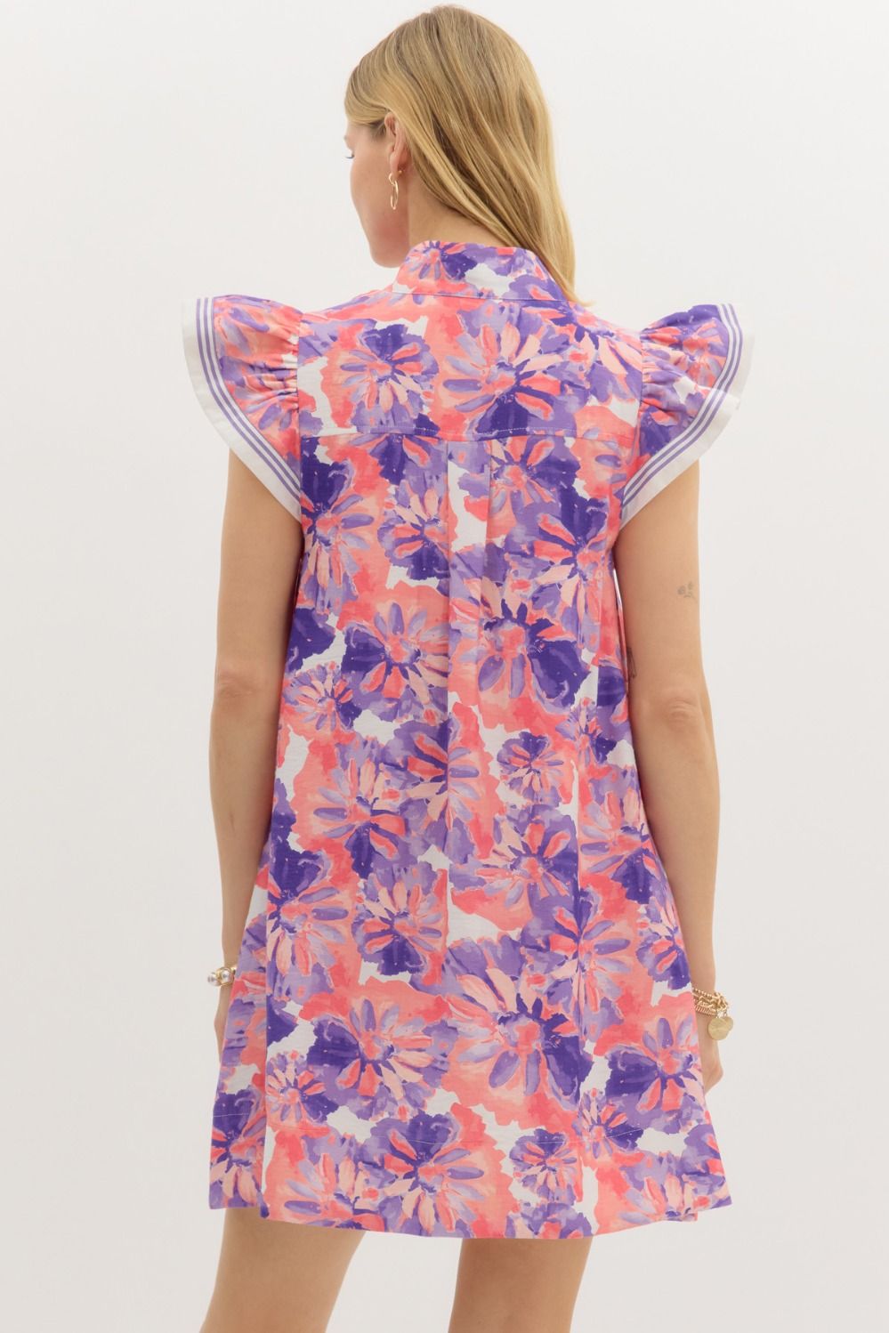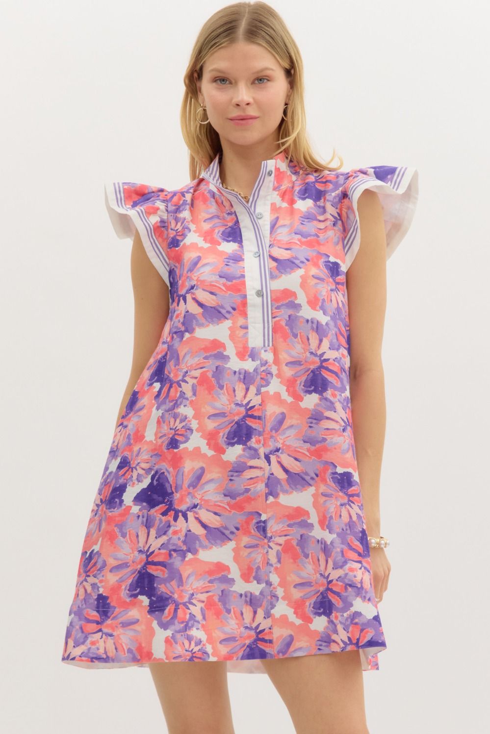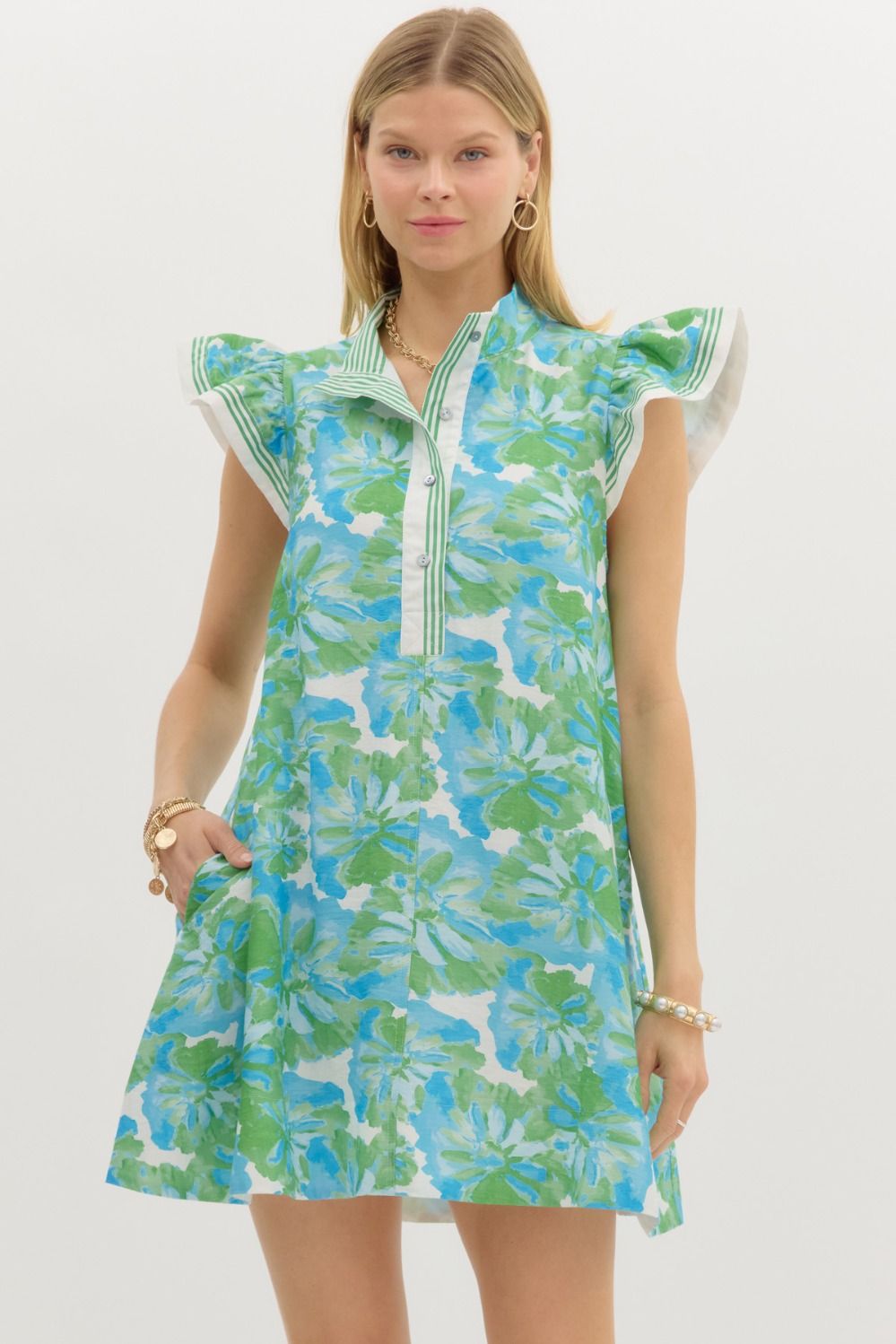 Feminine and fresh, this floral mini dress features flutter sleeves and contrast accent finishes that add a polished touch. Designed with a flattering pullover silhouette and handy side pockets, it’s fully lined and crafted from lightweight woven fabric for breezy, non-sheer comfort. Perfect for brunch dates, garden parties, or sunny day strolls.