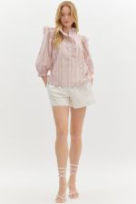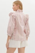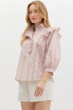 This floral print pullover top is a perfect mix of playful and elegant. The ¾ puff sleeves add a fun, feminine touch, while the band closure and shoulder ruffle that extends to the back give it a unique, eye-catching detail. The fabric button half placket front closure brings in a bit of classic charm, and the crochet edge trim adds a sweet, delicate finish. Made from lightweight, non-sheer woven fabric, it’s perfect for warmer days and super easy to pair with your favorite jeans or skirts. Unlined for a breathable feel, this top is a go-to when you want to look cute without too much effort.