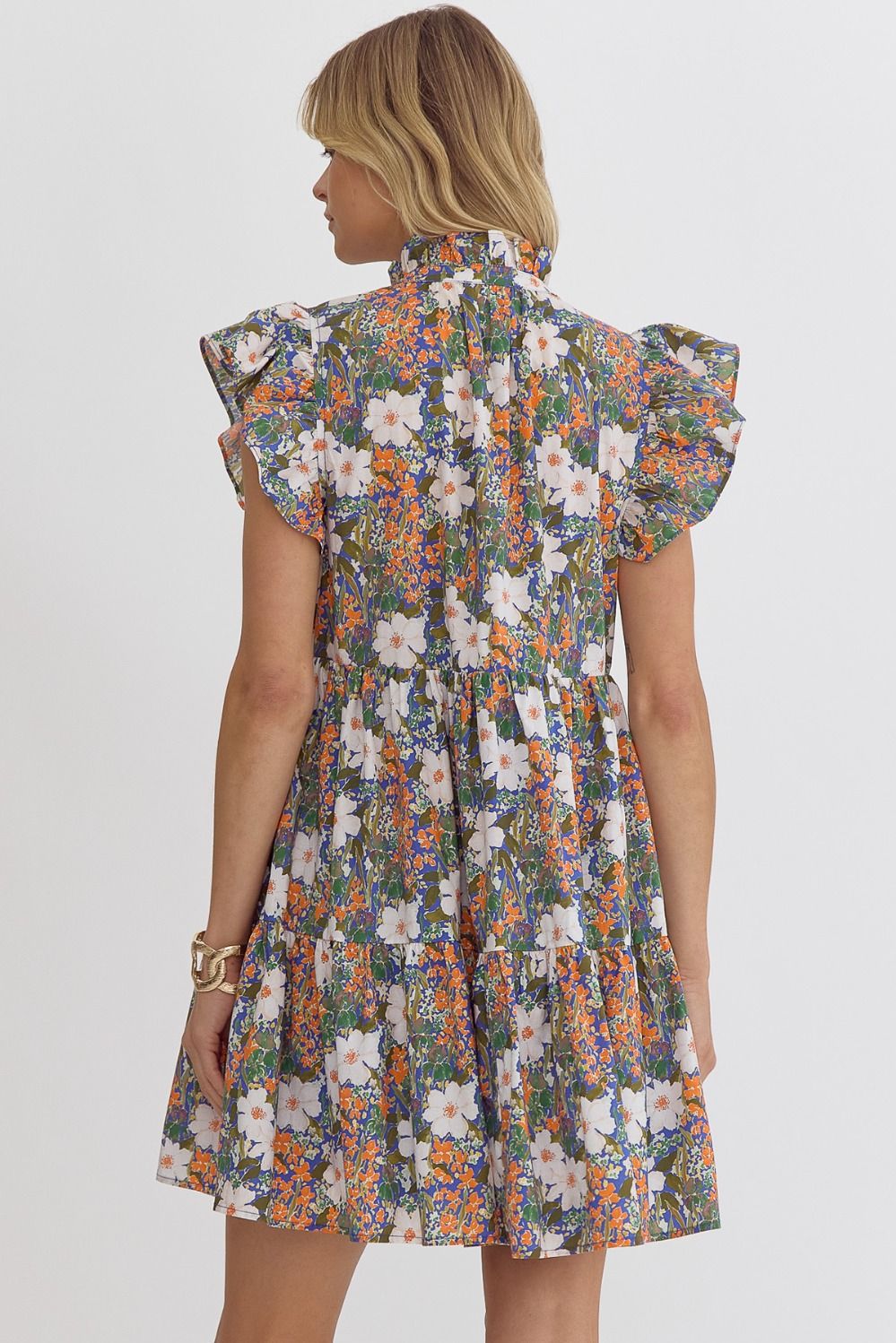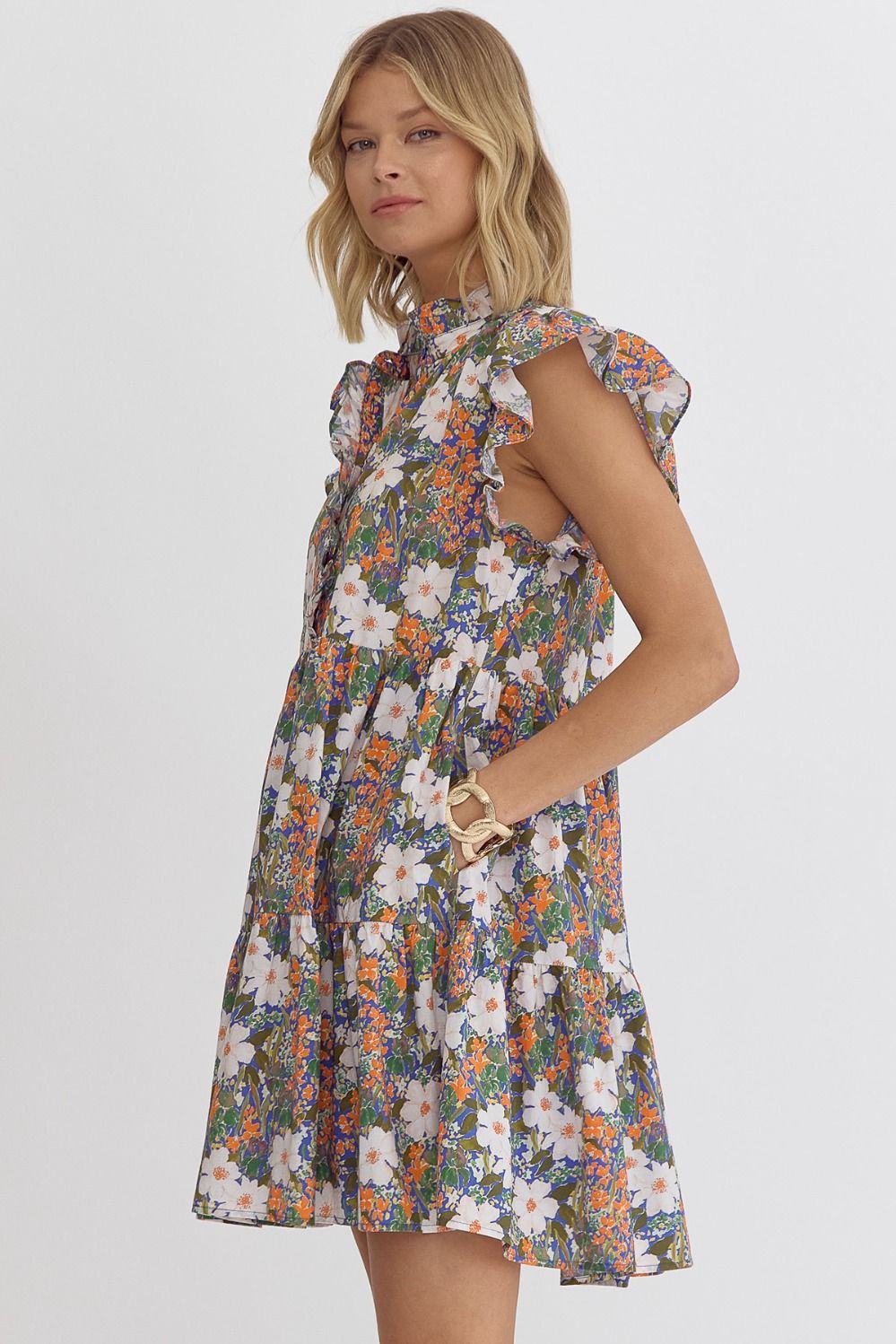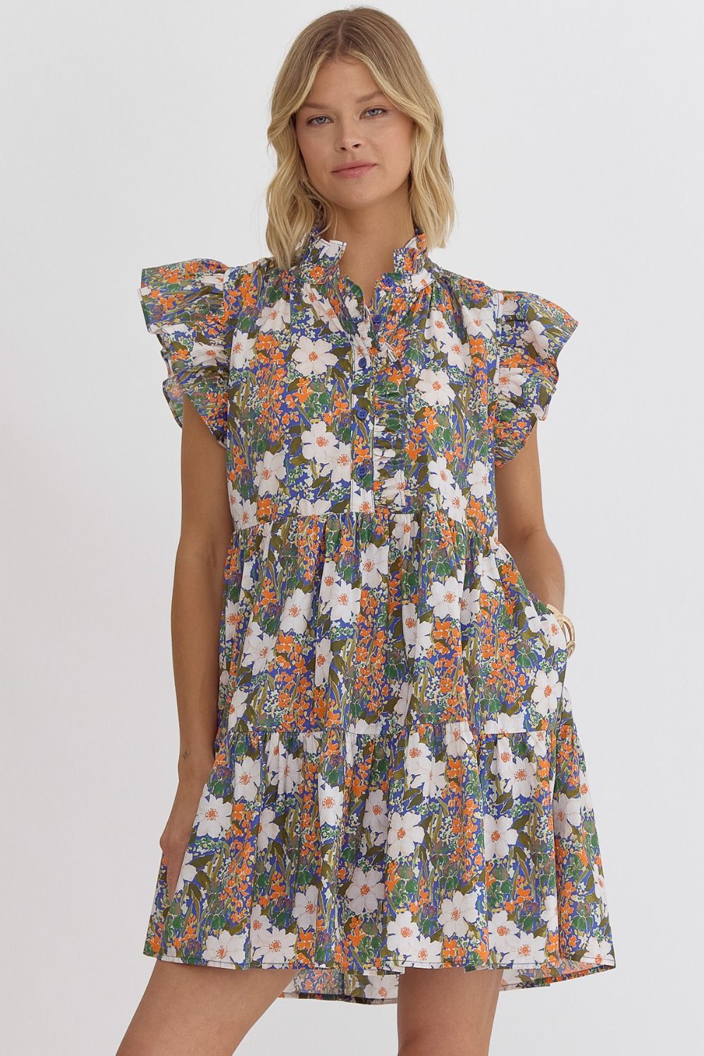 This dress is absolutely charming! The floral print and ruffle sleeves offer a feminine and romantic vibe, perfect for spring or summer. The button closure at the chest adds a delicate detail, while the pockets at the sides offer both style and functionality. Being lined, woven, non-sheer, and lightweight, it's likely comfortable and easy to wear, allowing for movement and breathability.