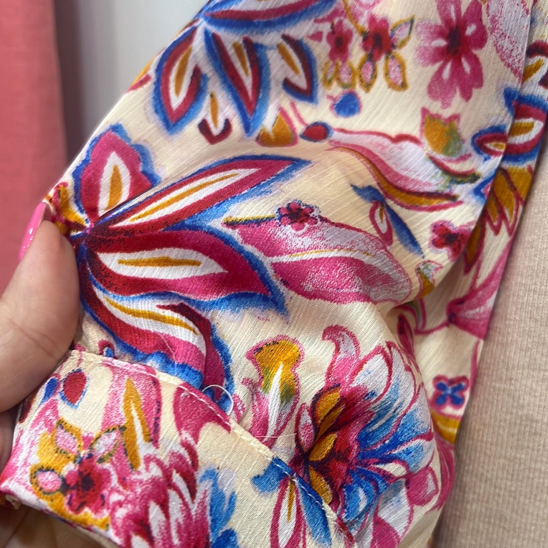This shirt is a stylish fusion of comfort and floral charm - a crew neck sweater featuring vibrant floral sleeves! Walk into Spring with this beautiful top for a pop of color!