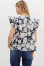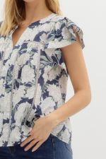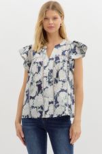 Floral V-Neck Flutter Sleeve Top with Lace Trim