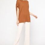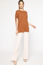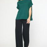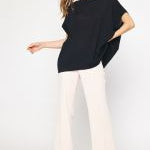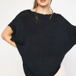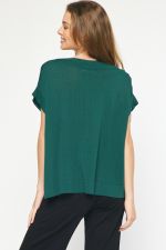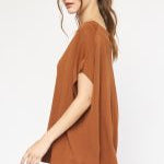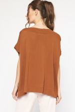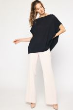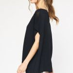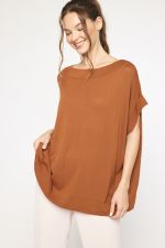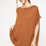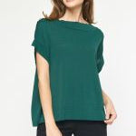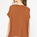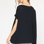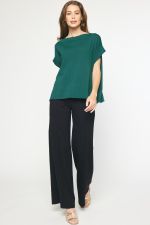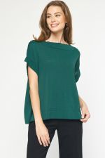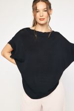 Solid boat neck short sleeve top featuring dolman sleeves. Unlined. Knit. Non-sheer. Lightweight.