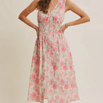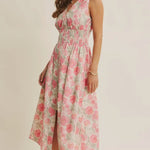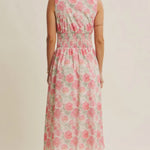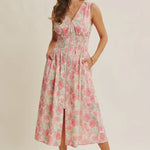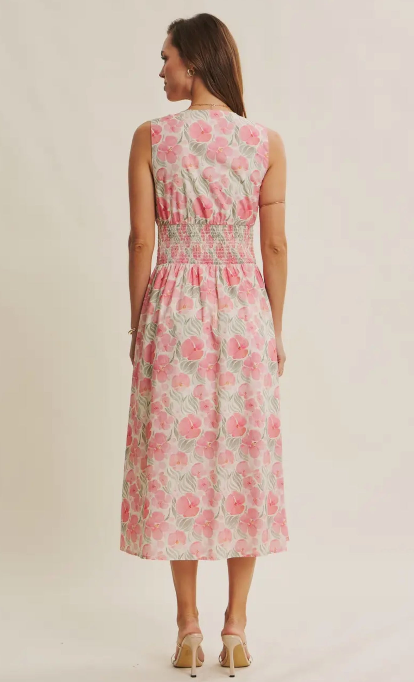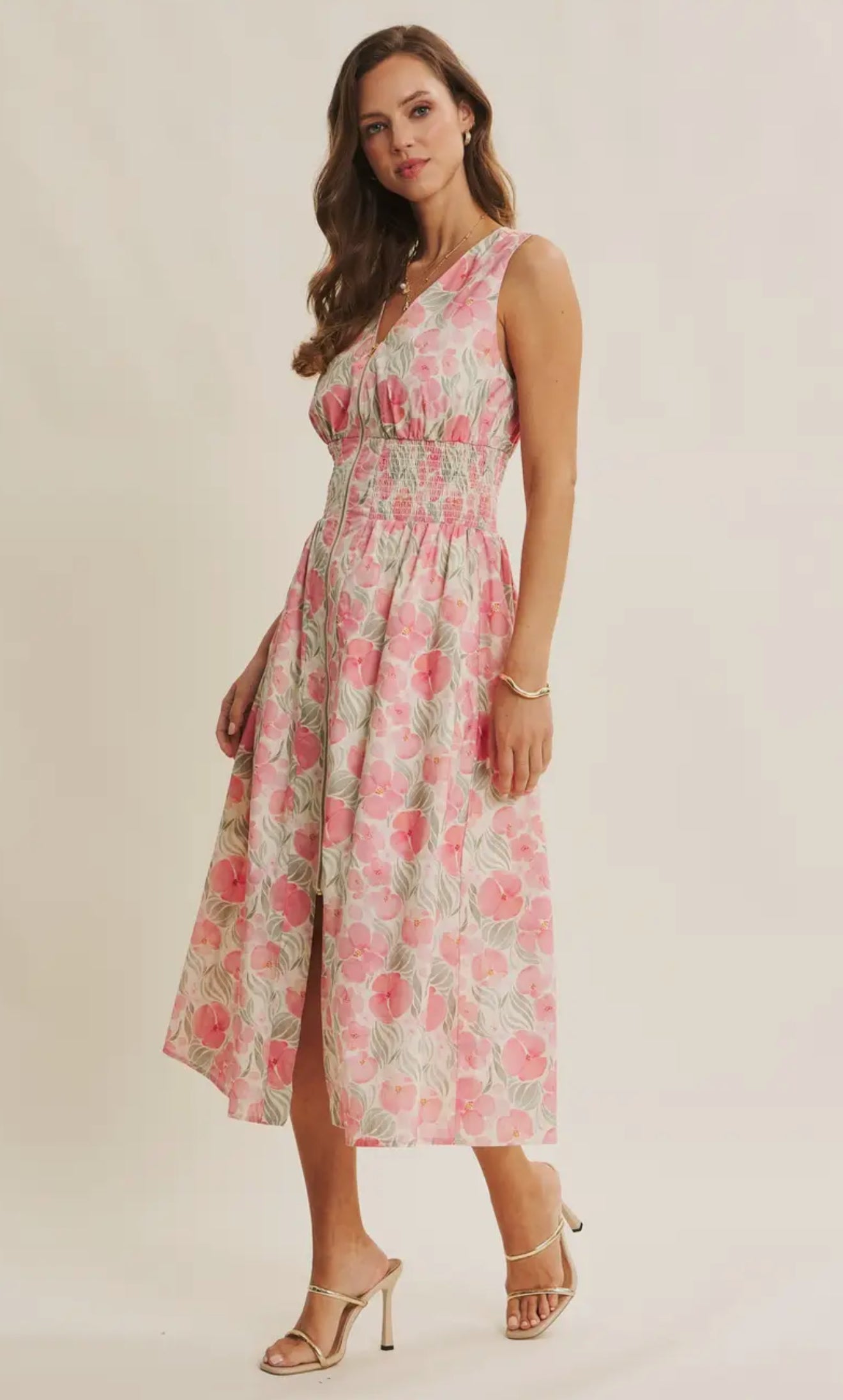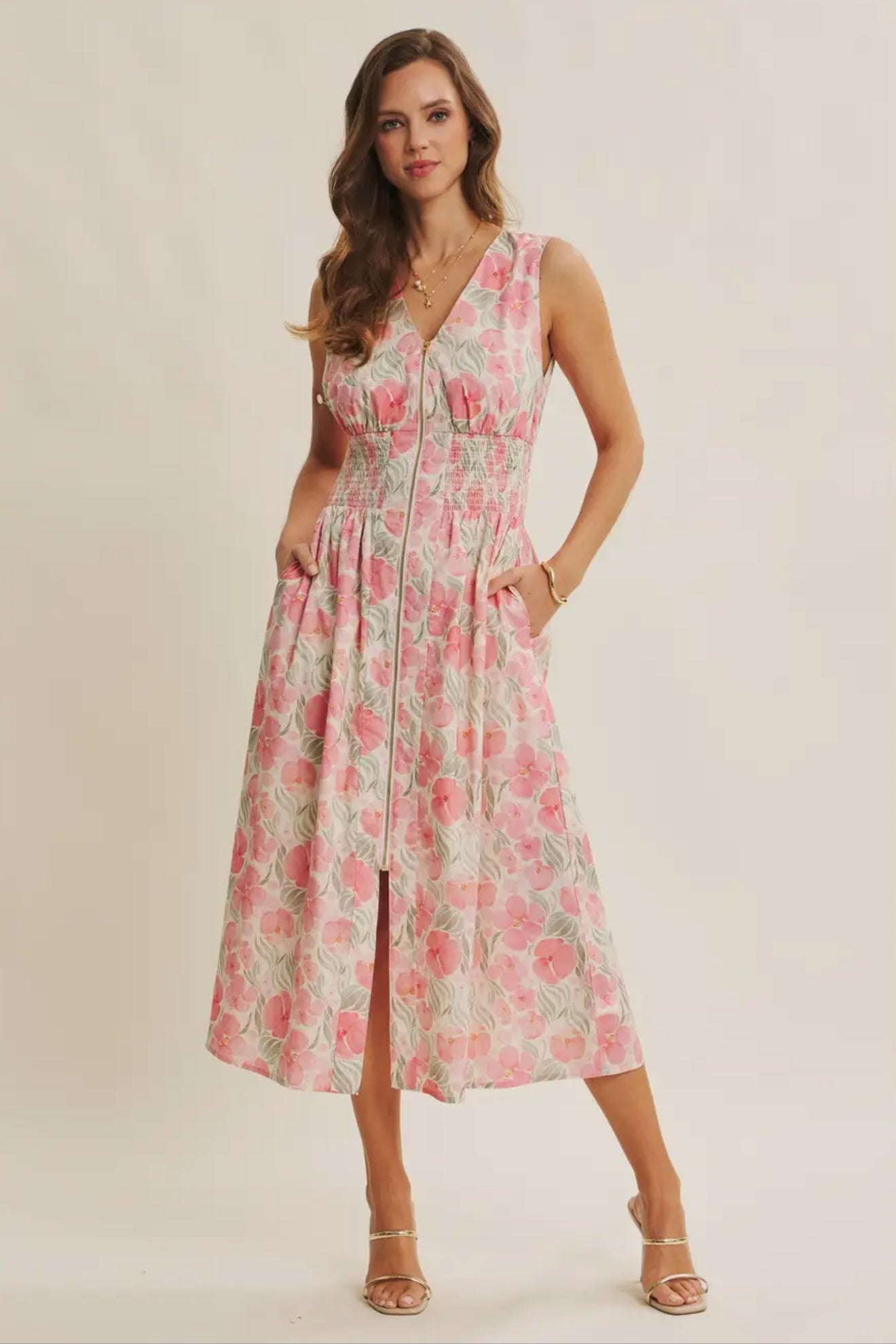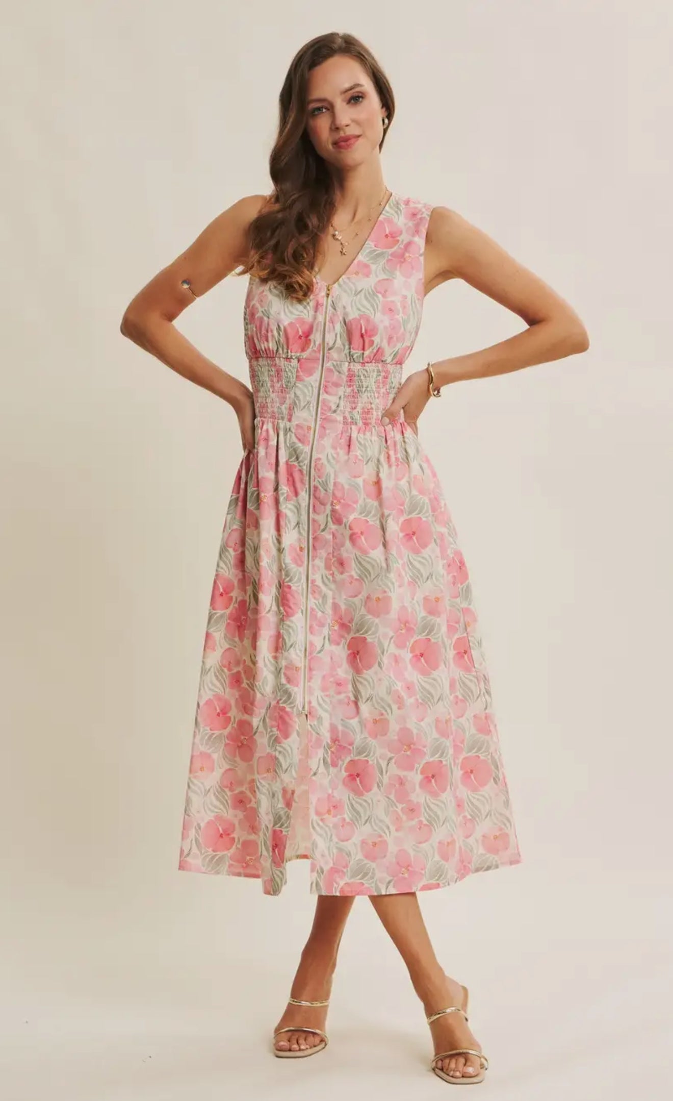 The V-neckline and clean sleeveless bodice create a feminine silhouette, while the smocked waist offers a comfortable, flattering fit you can move in all day. The center-front zipper adds a modern touch and easy wearability, making this dress both beautiful and functional.