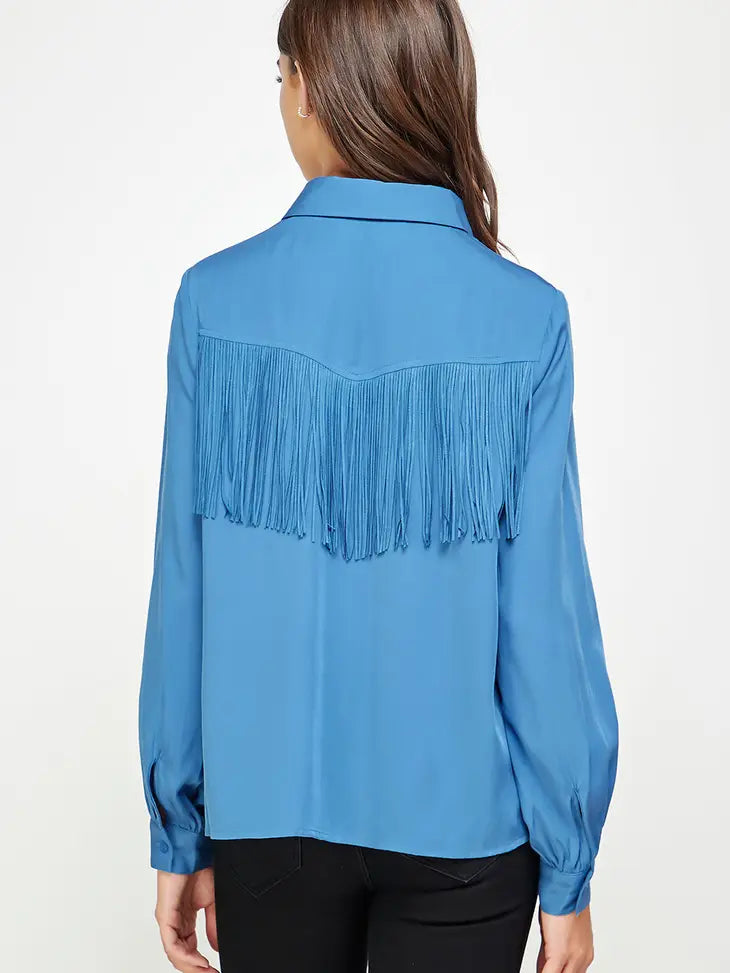 Fringed Button Up Shirt in soft Rayon woven fabric. This style features button down closure at front, spread collar, buttoned cuff, and fringe detail in suede at front/back yoke.