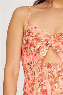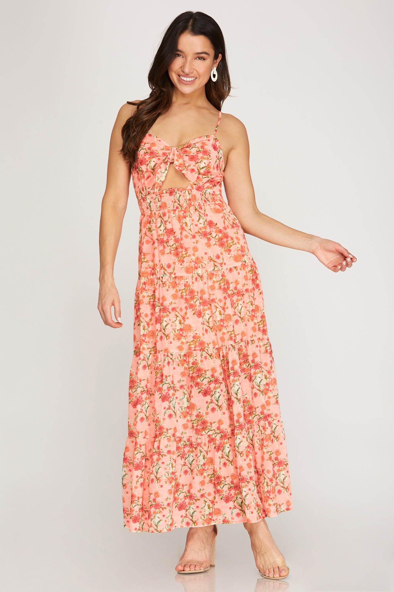SLEEVELESS WOVEN FLORAL PRINT MAXI DRESS WITH FRONT TIE