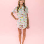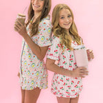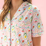 Sweet dreams meet fruity fun in our Fruit Cocktail Pajama Set! Made from our signature buttery-soft fabric, this set is all about comfort with a playful twist. The top is breathable and cozy, while the shorts now feature a brand-new ruffle hem for an extra dose of sweetness. Whether you're lounging, napping, or sipping something refreshing on the porch, this set is your go-to for feeling cute and comfy all summer long. Available in 4 sizes: x-small (0-2), small (4-6), medium (8-10) and large (12-14)