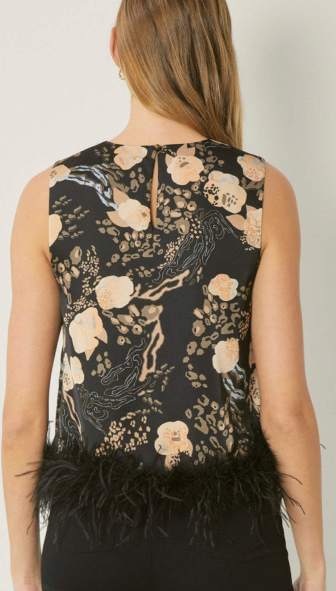 Print round neck sleeveless top featuring faux feather trim at hem. Keyhole button closure at back. Lined. Woven. Non-sheer. Lightweight