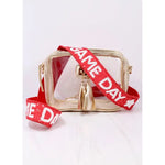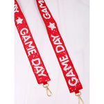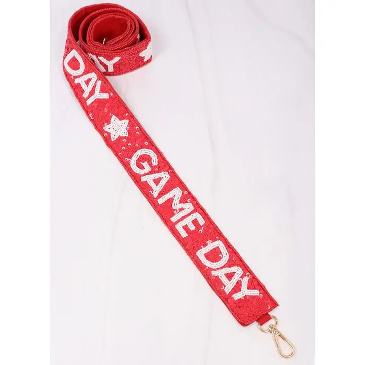 Add some color to your outfit with this sequin, two tone purse strap! It has "Game Day" in accent beading with matching beaded stars as well. The back has a smooth linen-feel, so it won't pull at your clothing. Pair with a clear bag for an added fun touch! Dimensions: 47" with clips