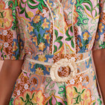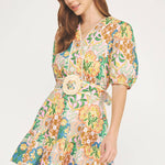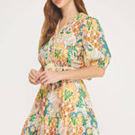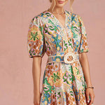 V-neck short puff sleeve mini dress in an exclusive floral botanical garden party print on stretch cotton poplin fabric. This vibrant boho fit and flare mini dress features contrast braided crochet rope trim throughout belt/neckline/hem, puff short sleeve with elastic cuff, removable matching belt with straw/raffia circle buckle, cinched waist with elastic smocking at back, tiered mini skirt, a classic V neck, hidden zipper closure and lining. Perfect for summer weddings, vacation, brunch, or upscale casual events.