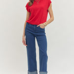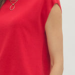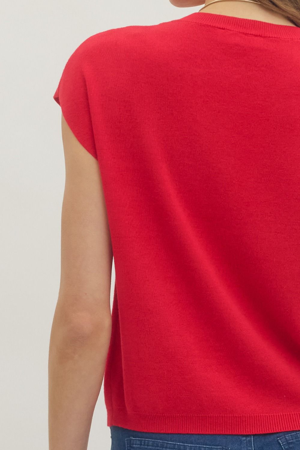 Solid cap sleeve knit top featuring round neck. Unlined. Knit. Non-sheer. Lightweight.