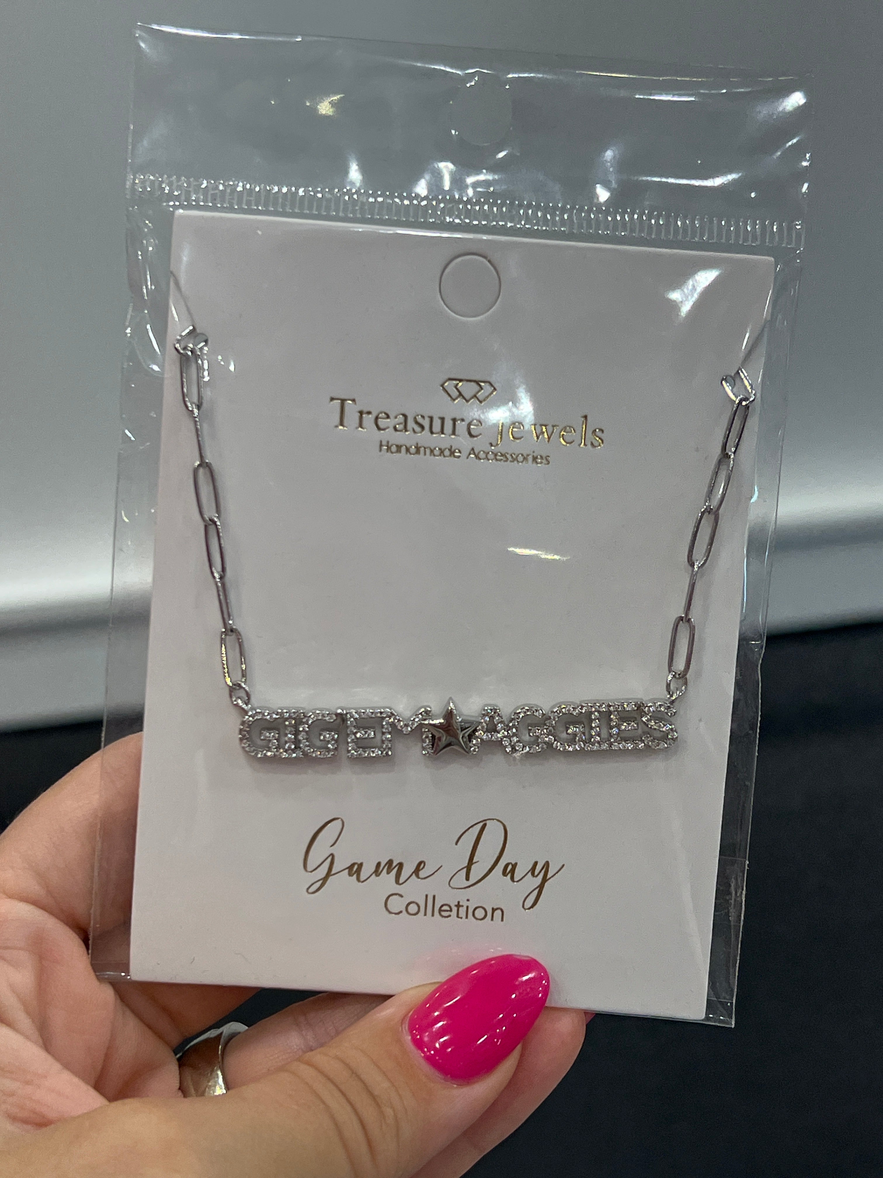 Show your team spirit for your favorite college with our Gig'em Aggies necklace available in silver to go with all your favorite pieces! These necklaces offer silver Crystal with Clear Coat to protect the color! These necklaces length are 16 inches + 3 inches Extender.