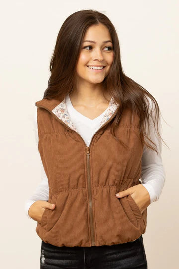 The Gillian Reversible Puffer Vest offers versatile style with its dual-sided design. One side features a classic brown color, while the other showcases a vibrant floral print, allowing you to switch up your look effortlessly. The vest is designed with a relaxed fit and some stretch for comfort and ease of movement. It is fully lined for added warmth and a polished finish. Featuring practical pockets on both sides, it combines functionality with fashionable flair, making it an ideal layering piece for various outfits and occasions.