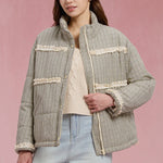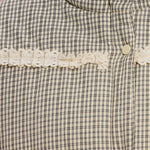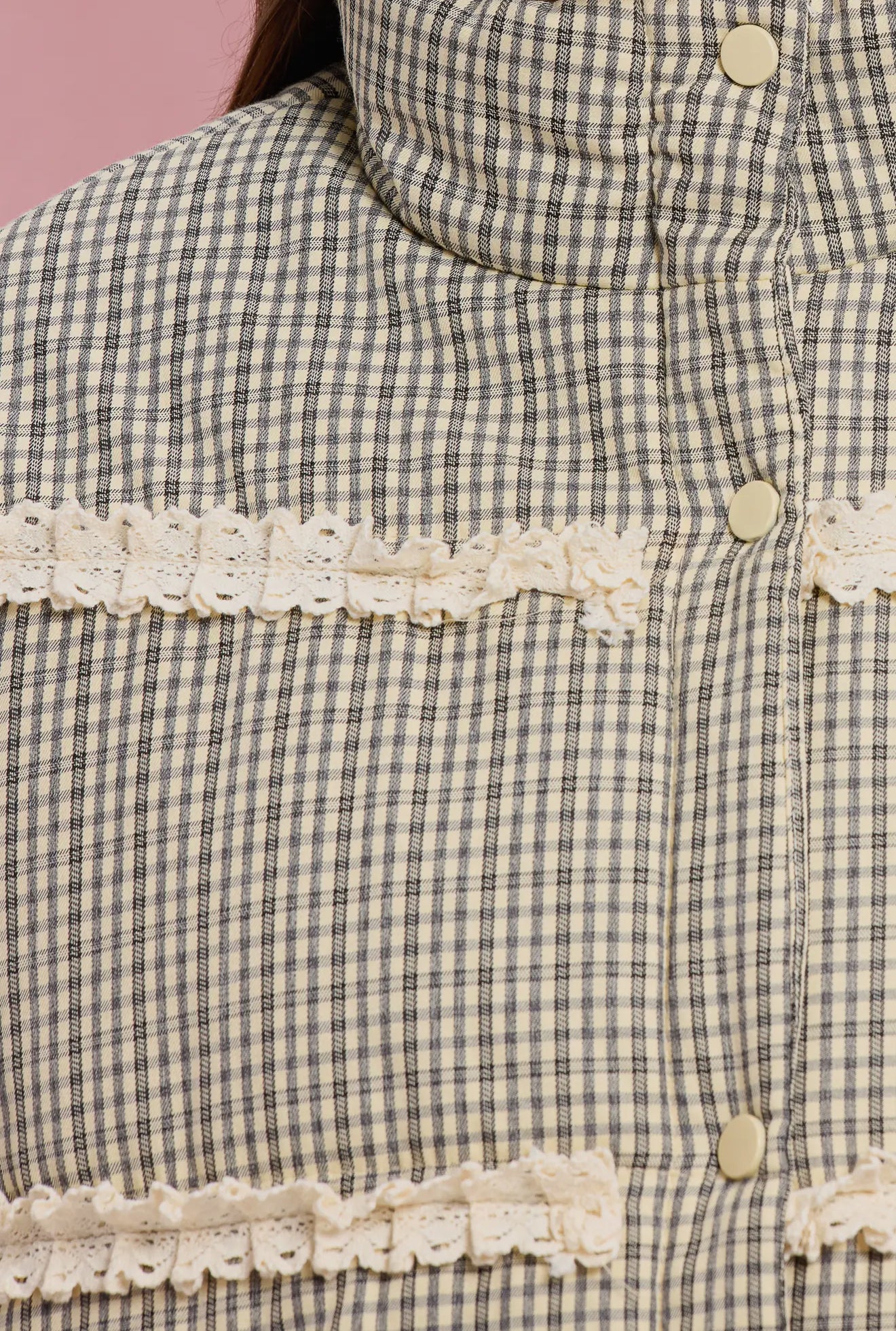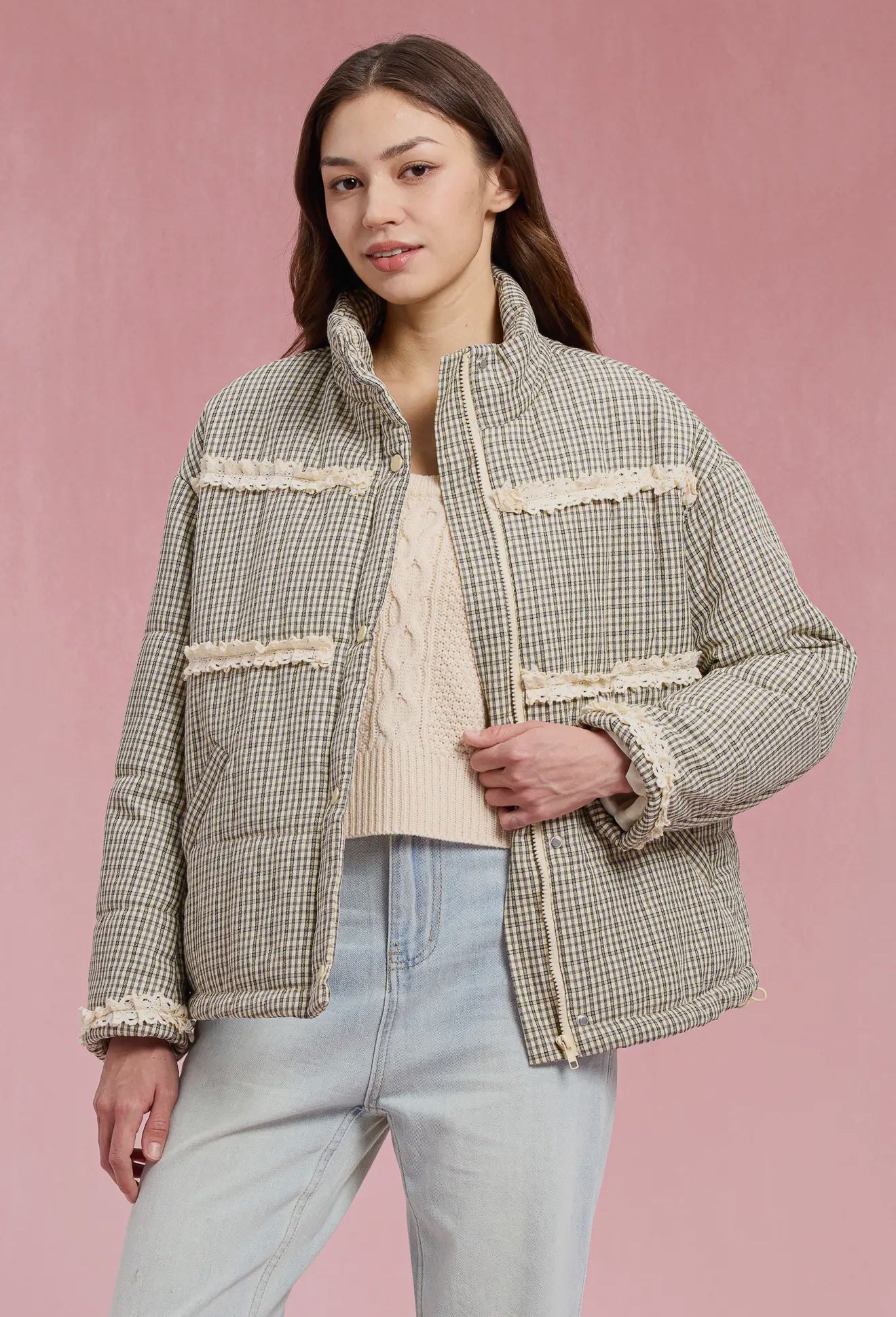 Quilted puffer jacket features a classic gingham check pattern accented with cream ruffle lace trims across the chest and cuffs.