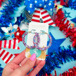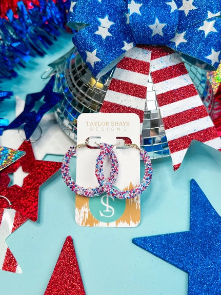 Add a sparkling touch of patriotism to your ensemble with these dazzling Glitter Hoop Earrings in red, white, and blue. Crafted to capture the spirit of celebration, these hoops feature a mesmerizing swirl of glitter in the iconic colors of the American flag. The vibrant hues evoke images of fireworks against the night sky, making these earrings the perfect accessory for Fourth of July festivities, Memorial Day picnics, or any occasion where you want to showcase your pride for your country.