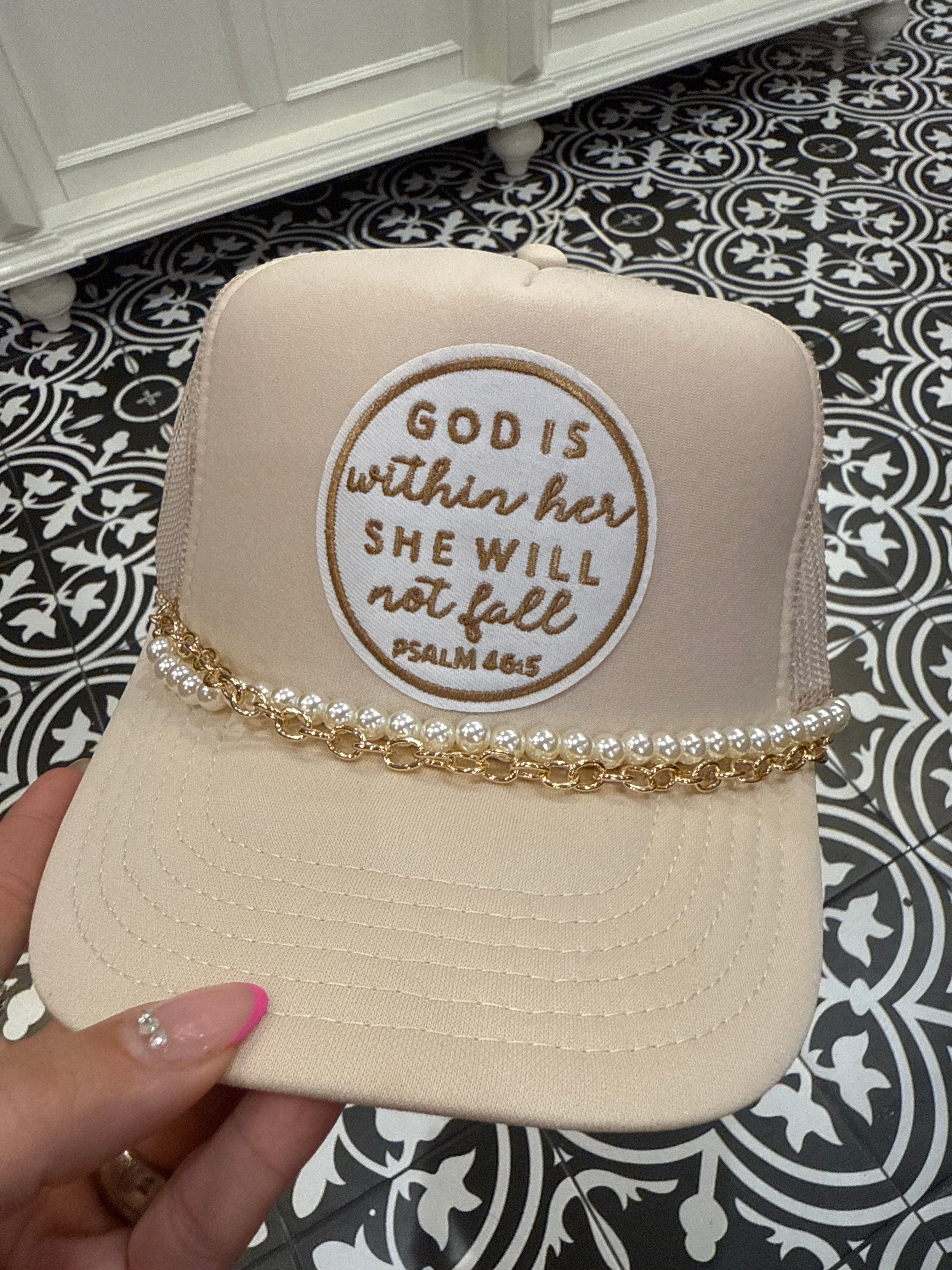Add a little sass to your style with our God is within her hat! Featuring a cute patch and gold & pearl chains for added decor! This cap is sure to be your go-to accessory all season long.