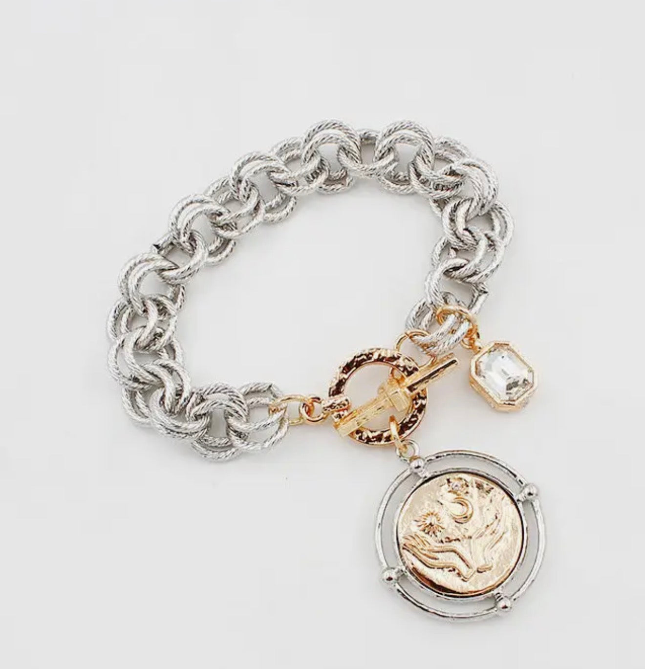 Showcase your love for unique jewelry with our Silver Layered Chain Bracelet. This piece features a silver and gold coin charm, adding a touch of elegance to your ensemble. This toggle bracelet is an excellent choice for those who love to keep up with the latest trends. Wear it alone or pair it with other pieces for a layered look. This bracelet is more than just an accessory.
