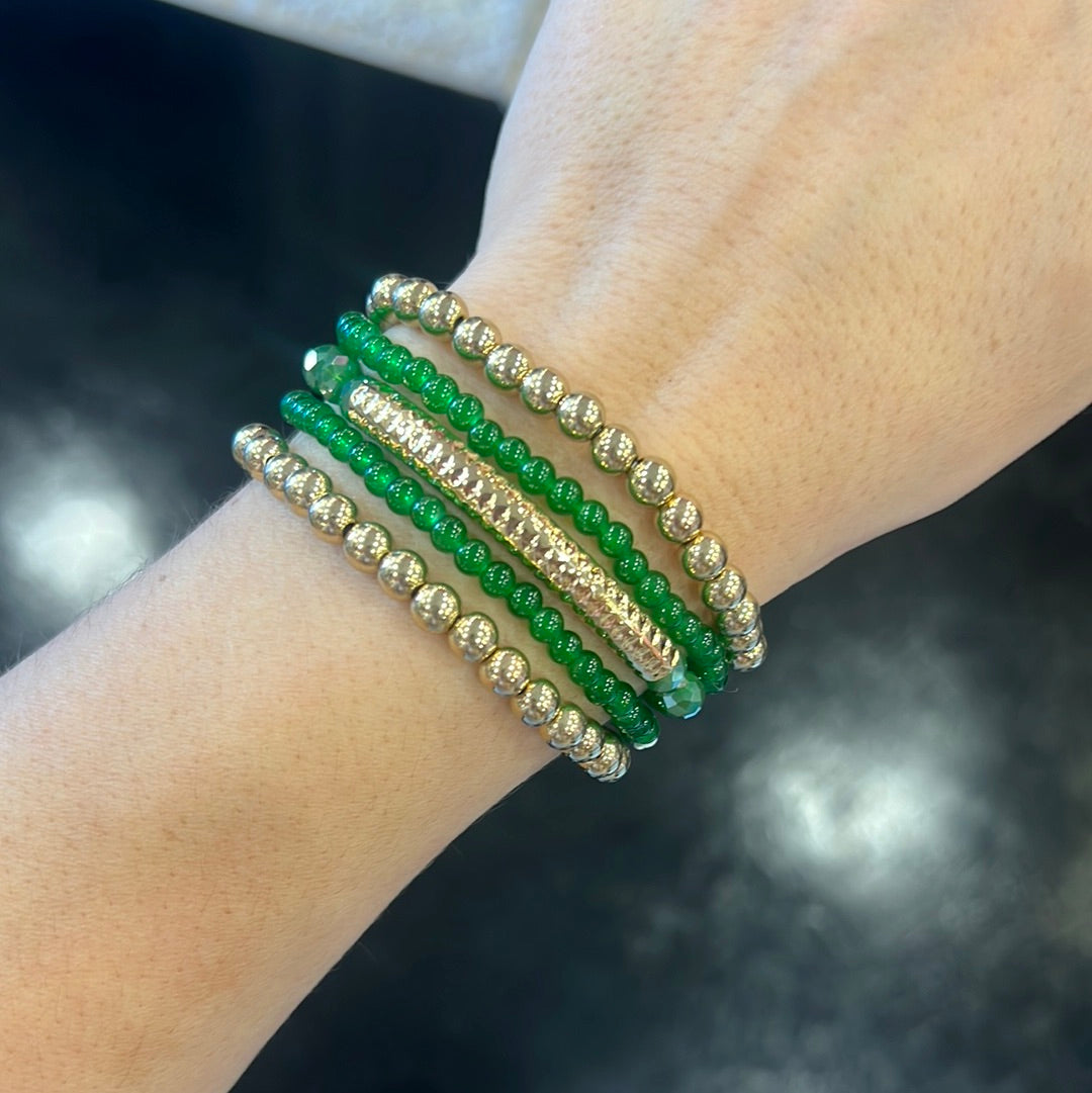 This Bracelet set combines the opulence of gold with the refreshing allure of green. Adorned with long metal gold pieces, this set exudes a unique and stylish charm. The combination of colors and the elongated gold elements create a captivating accessory making it a statement piece that effortlessly enhances your wrist.