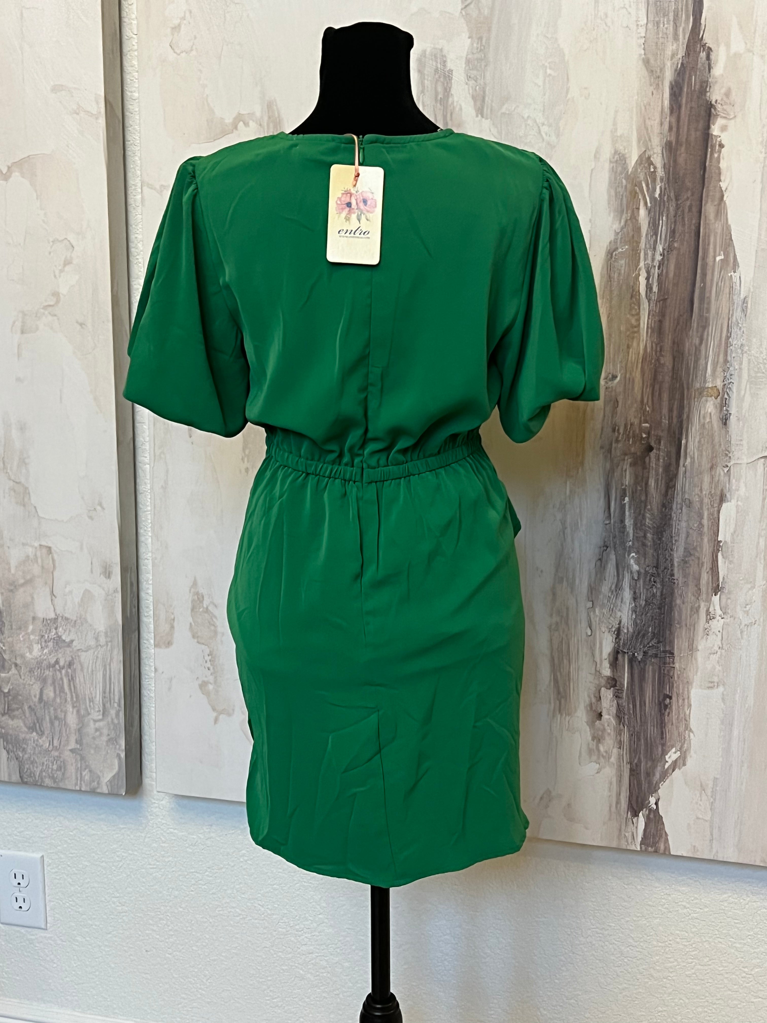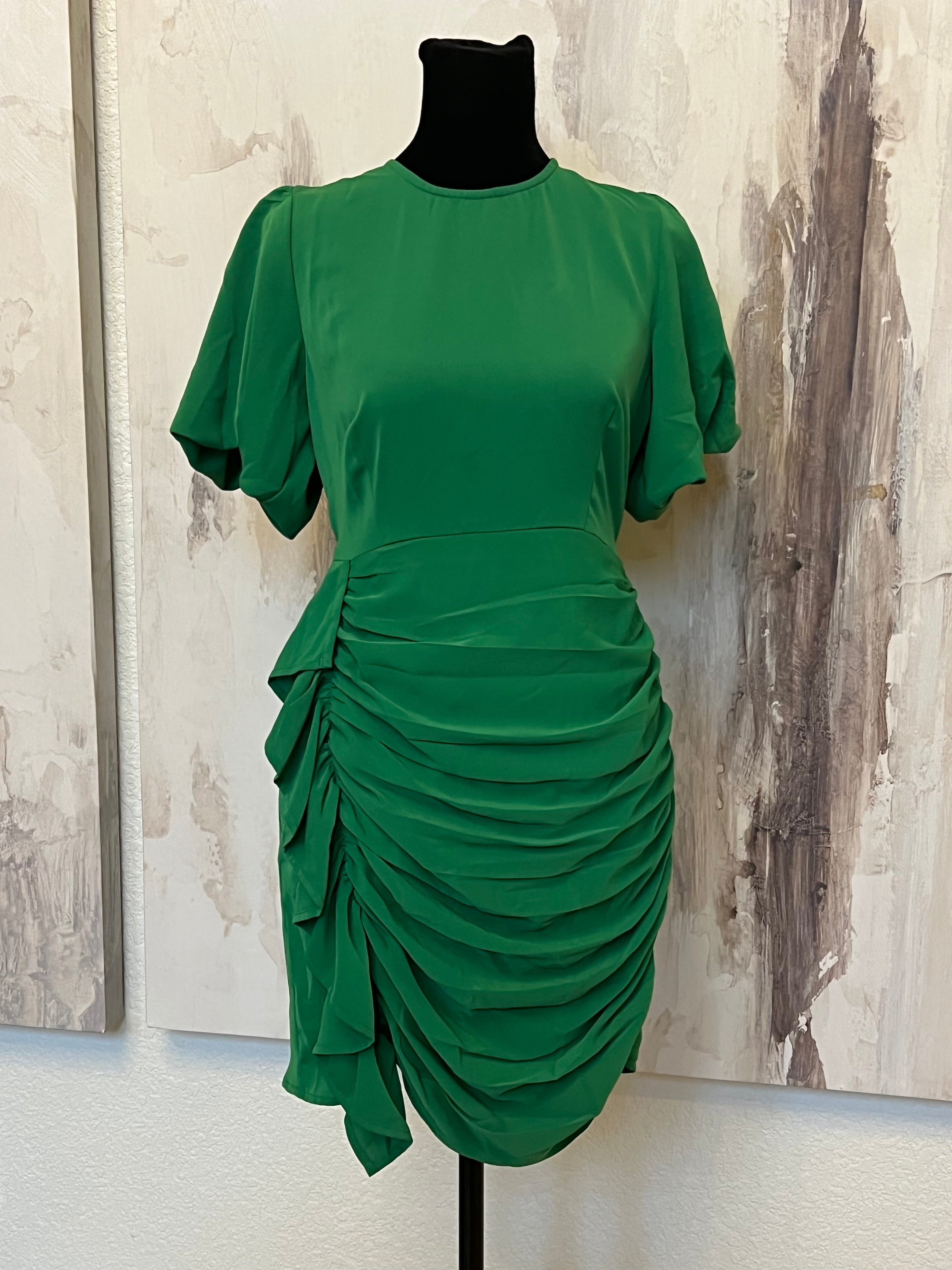 Solid round neck bubble sleeve mini dress featuring ruched skirt and ruffle detail. Invisible zipper on side. Lined. Woven. Non-sheer. Lightweight.