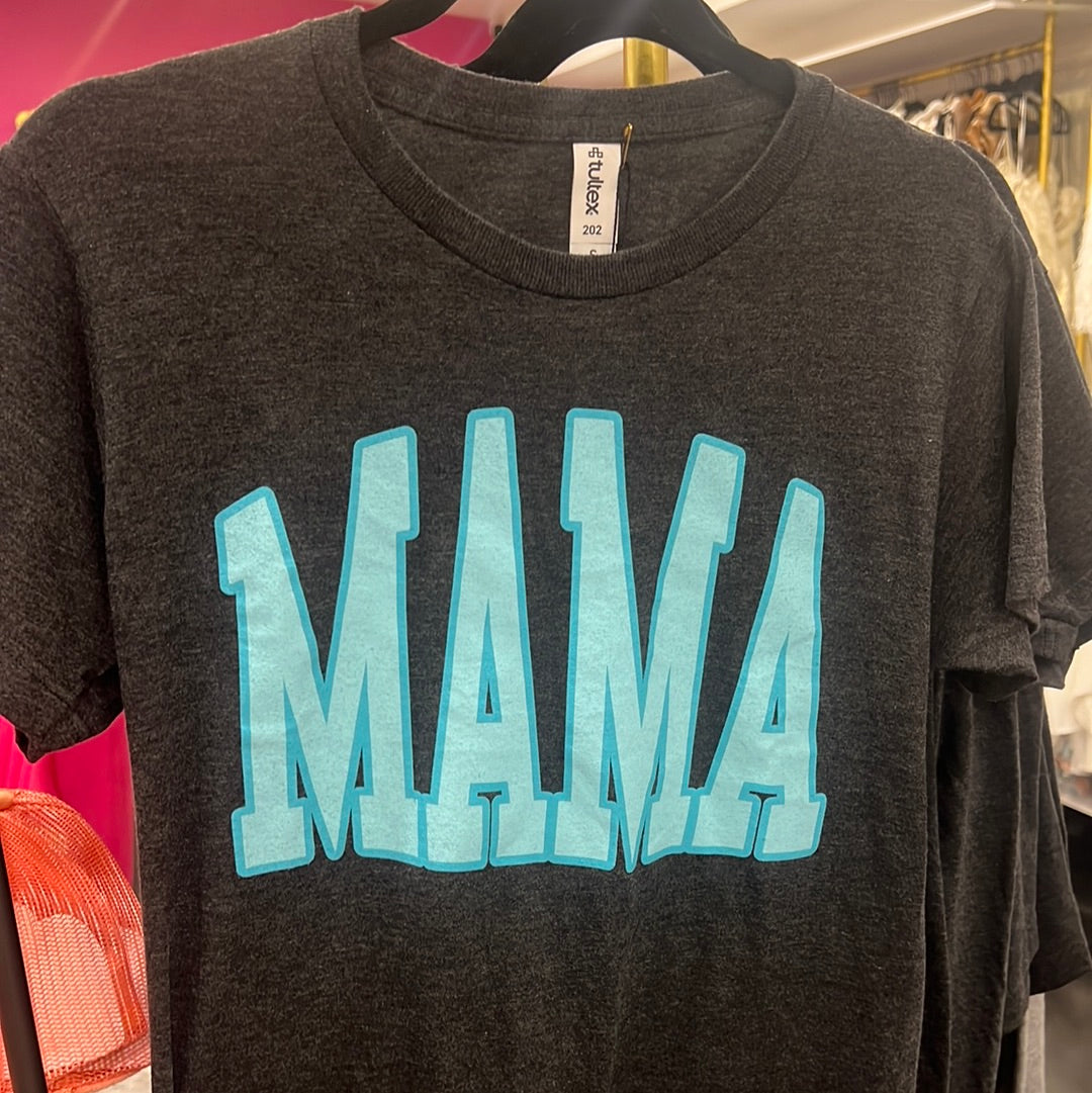 Introducing a chic and stylish addition to anyone's wardrobe for this upcoming Mother's Day! This dark grey tee featuring the endearing term "Mama" printed in light blue, with each letter bordered in a deeper shade of blue for a subtle yet eye-catching effect! Celebrate the strength and love of motherhood with this simple yet impactful design!