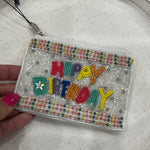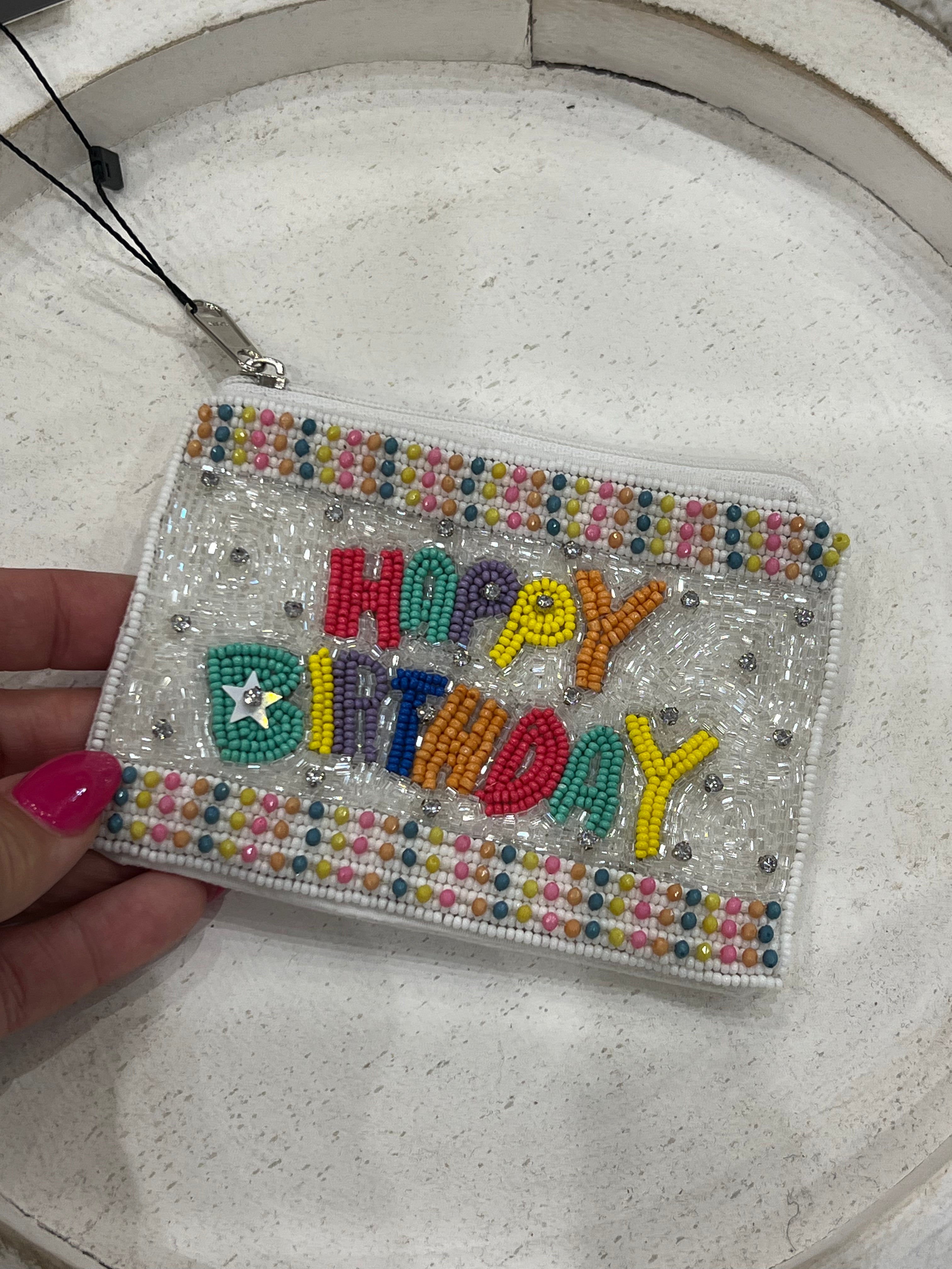 This beaded coin purse is a charming and celebratory accessory, perfect for commemorating a special birthday occasion. Its sleek and compact design makes it a stylish addition to any ensemble, while its intricate beadwork and sparkling rhinestones add a touch of whimsy and glamour. At the center of the purse, the words "Happy Birthday" are spelled out in vibrant colors, with each letter adorned in a different hue. This playful arrangement adds a cheerful and festive vibe to the accessory, capturing the joy and excitement of a birthday celebration. In addition to the colorful beadwork, the face of the bag is embellished with sparkling rhinestones, which twinkle and shimmer in the light, adding an extra layer of dazzle and glamour.