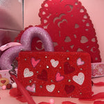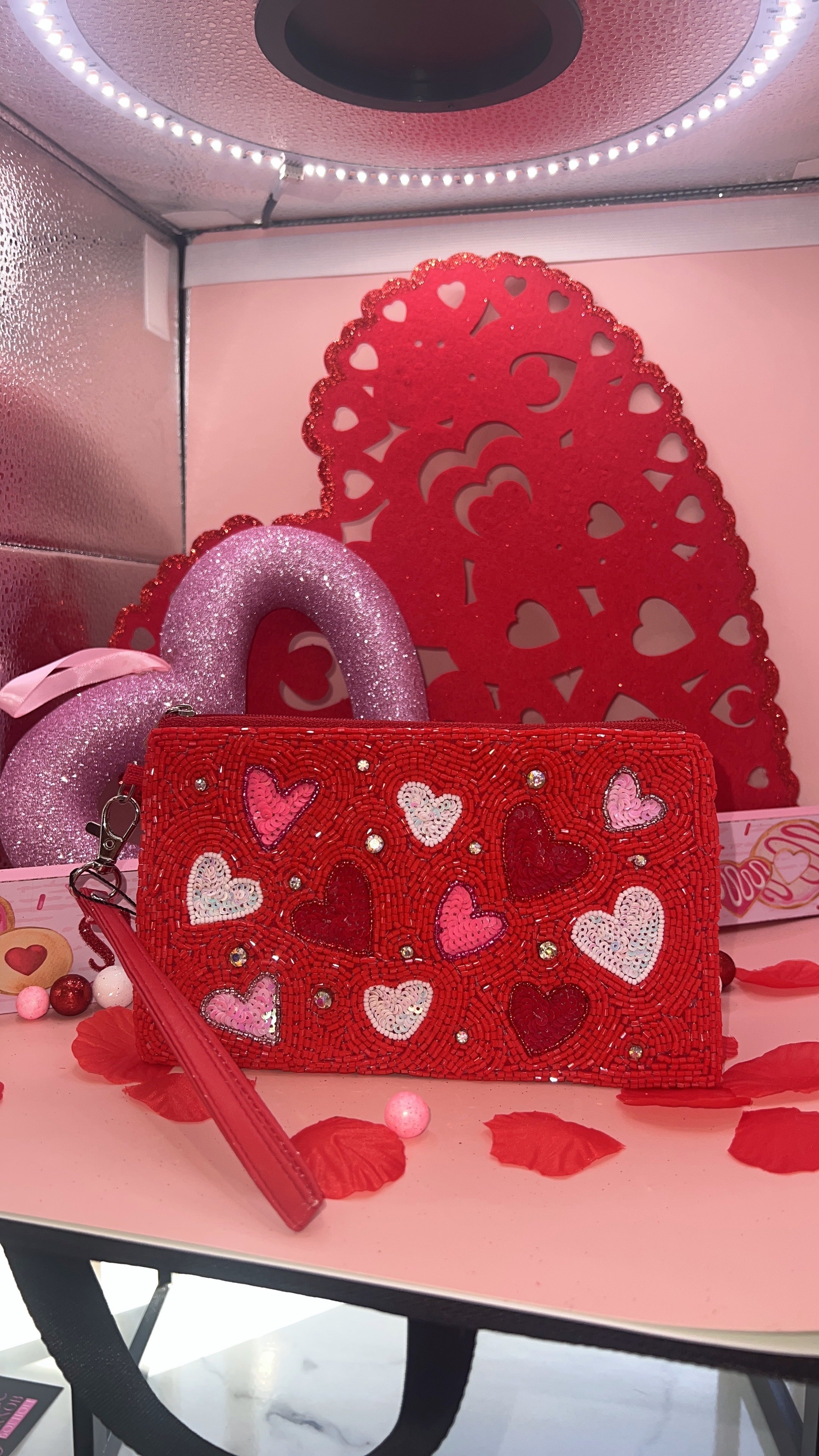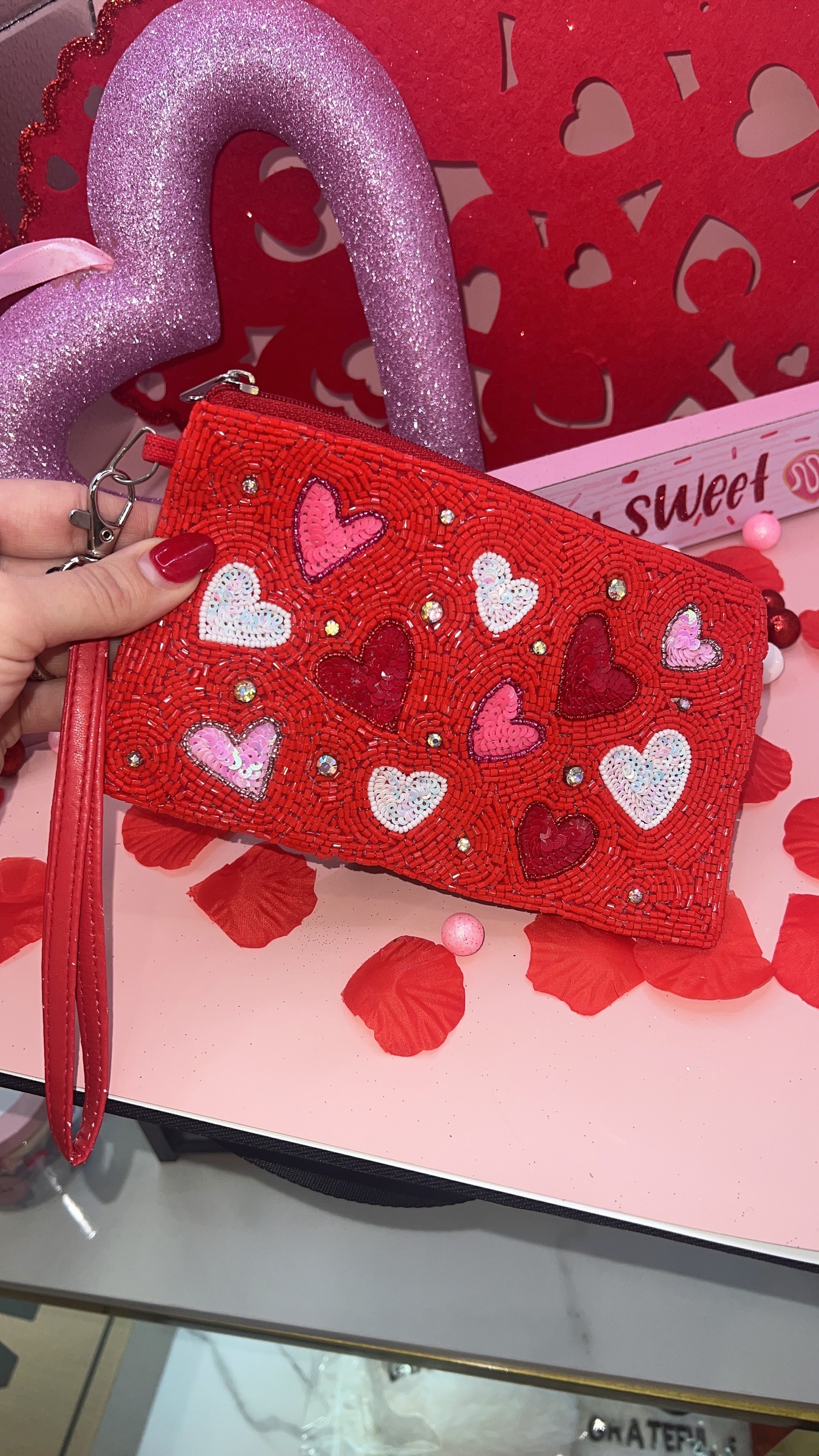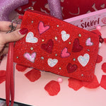 Embrace love in every detail with our exquisite Beaded Heart Pouch, measuring a stylish 6 1/2 x 4 1/2 inches. This enchanting pouch is adorned with a medley of multi-sized hearts in shades of red, white, and pink, creating a visual symphony of affection. The entire coin purse is meticulously beaded in radiant red, ensuring a luxurious feel. Complete with a convenient wristlet attachment, it seamlessly combines fashion and functionality. Elevate your style with this captivating accessory that's not just a pouch – it's a celebration of love in every bead. Carry your heart on your wrist and make a statement this season!