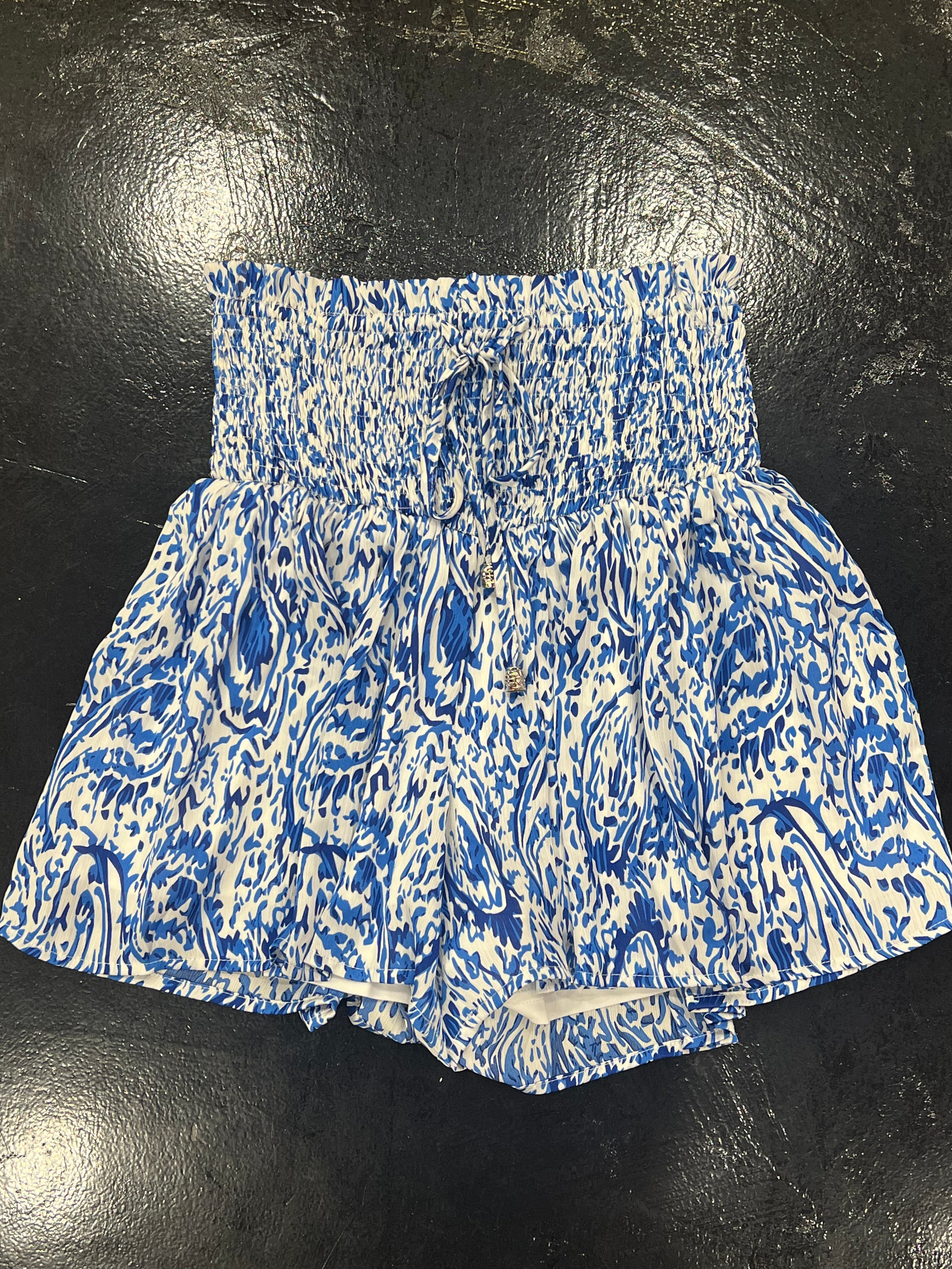 Print high waisted shorts featuring smocking detail at waist. Drawstring at front. Lined. Woven. Non-sheer. Lightweight.