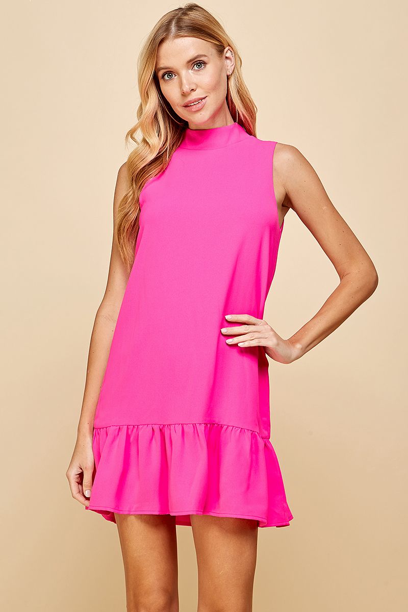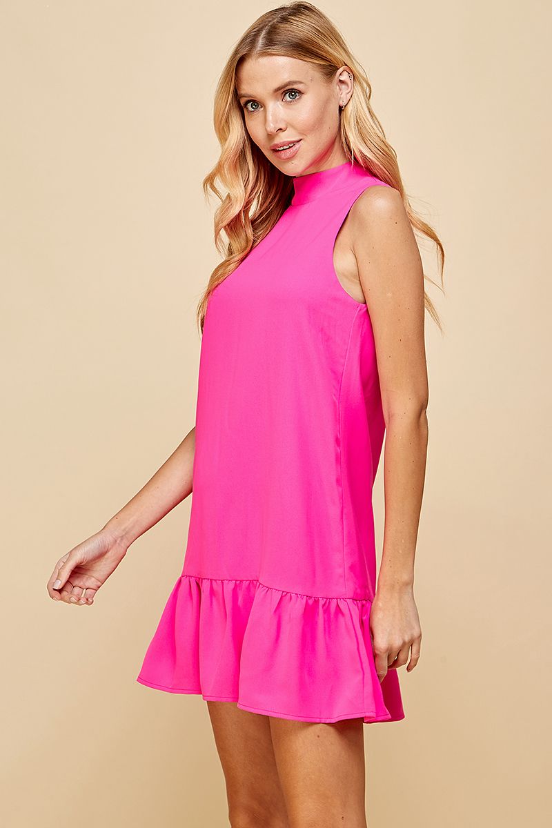 A high neck dress featuring dropped waist, ruffle hem and back hidden zipper. Model Size + Fit: Model height: 5'9" Dress size: 2 Bust: 33 Waist: 25 Hips: 34 Fabric content: 100% Polyester