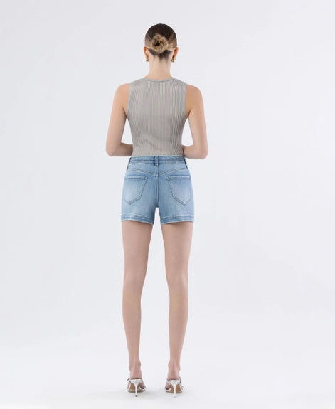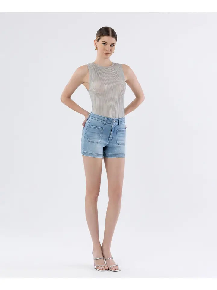 High rise seamless waistband patch pocket shorts Comfort stretch denim, high rise waist, seamless waistband, patch pocket, denim shorts F. Rise: 10" / inseam: 4" / leg opening: 23 1/2" Model is 5'10" wearing a size small