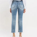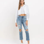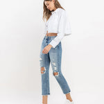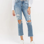 High rise slim straight jeans crafted from comfortable stretch denim offer both style and flexibility. With a high-rise waist, they sit comfortably above the hips, providing a flattering fit. The distressed detailing adds a rugged, worn-in look, giving the jeans character and a touch of edginess. Their cropped length brings a contemporary vibe, perfect for showcasing your favorite footwear. As straight jeans, they offer a timeless silhouette that's versatile and easy to pair with a variety of tops and shoes. Overall, these jeans combine comfort, style, and modern trends for a wardrobe staple that's both fashionable and functional.