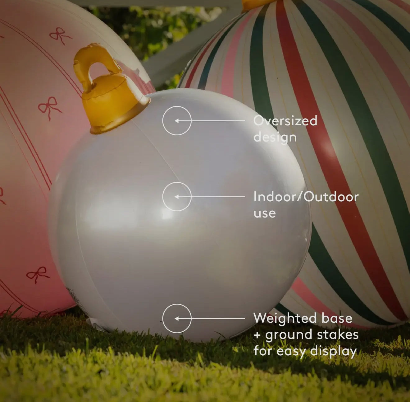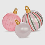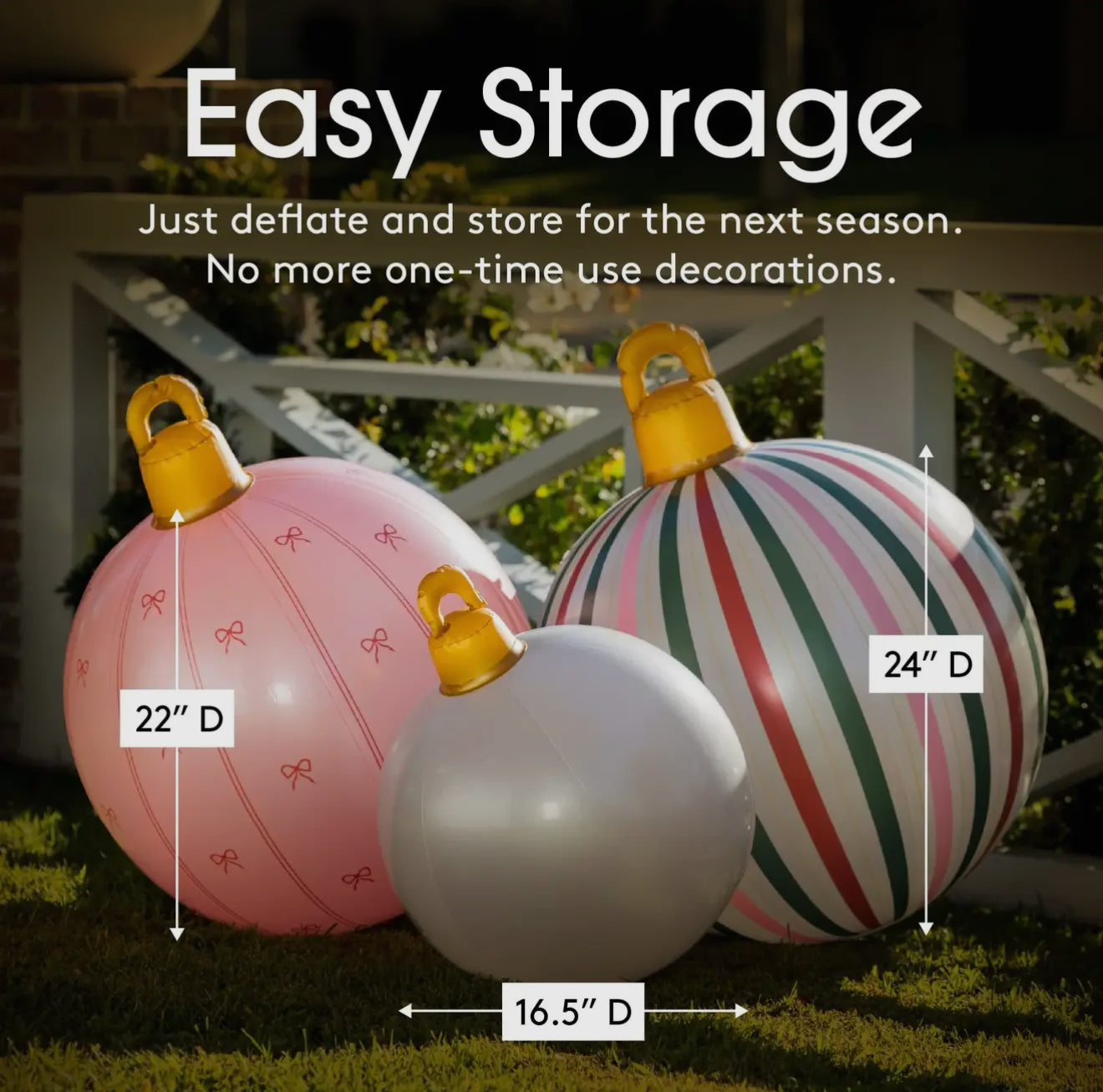 Add a pop of fresh color - introducing pink Christmas decorations. Santa will have no issues finding your house with these oversized light-up Pink Ornaments! Sold as a 3-pack with a Large (24"), Medium (22"), and Small (16.5"), these inflatables are perfect for indoor or outdoor use - they even float! Features include bright battery operated LEDs with 16 different colors and multiple light modes, including a flash and fade party mode. Remote control with timer. Built with a weighted base to stay upright, these ornaments bring a touch of Christmas magic that lasts through the season. The waterproof design allows for fun in the pool or snow! Inflatable and easy to store. Spread the cheer! Requires 3XAAA batteries per light (Batteries not included).
