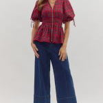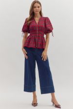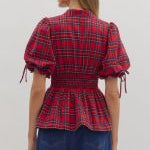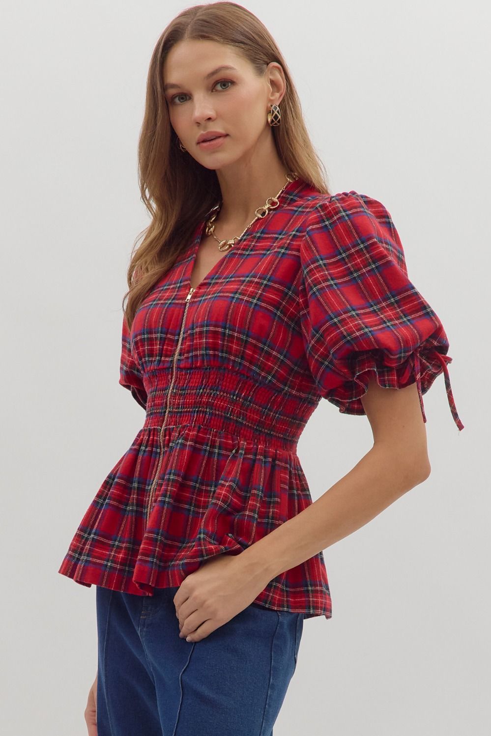 Plaid short puff sleeve top featuring smocked waist and tie accents at sleeves. Zipper closure at front. Unlined. Woven. Non-sheer. Lightweight. 100% Cotton