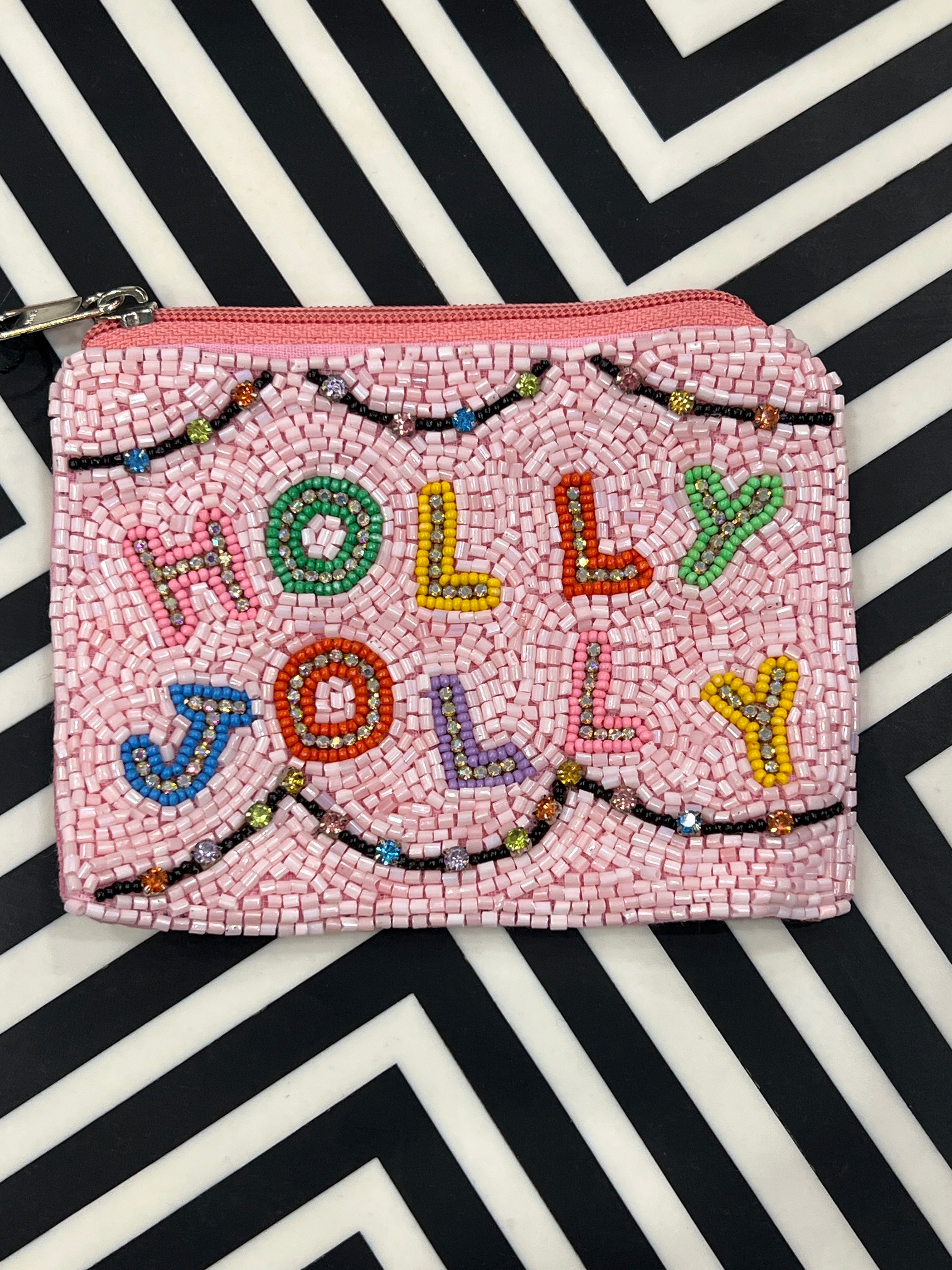 Imagine a charming pink beaded coin purse that's perfect for the holiday season! The words "HOLLY JOLLY" are playfully stitched across the front, each word in a different vibrant color that instantly lifts your spirits. Tiny rhinestones are artfully placed throughout, adding a touch of sparkle that catches the light beautifully. This little purse is not just adorable; it’s also practical for keeping your coins, cards, or small treasures safe. Whether you're heading to a holiday party or just want to carry a bit of festive cheer with you every day, this coin purse is a delightful accessory that’s sure to bring a smile!
