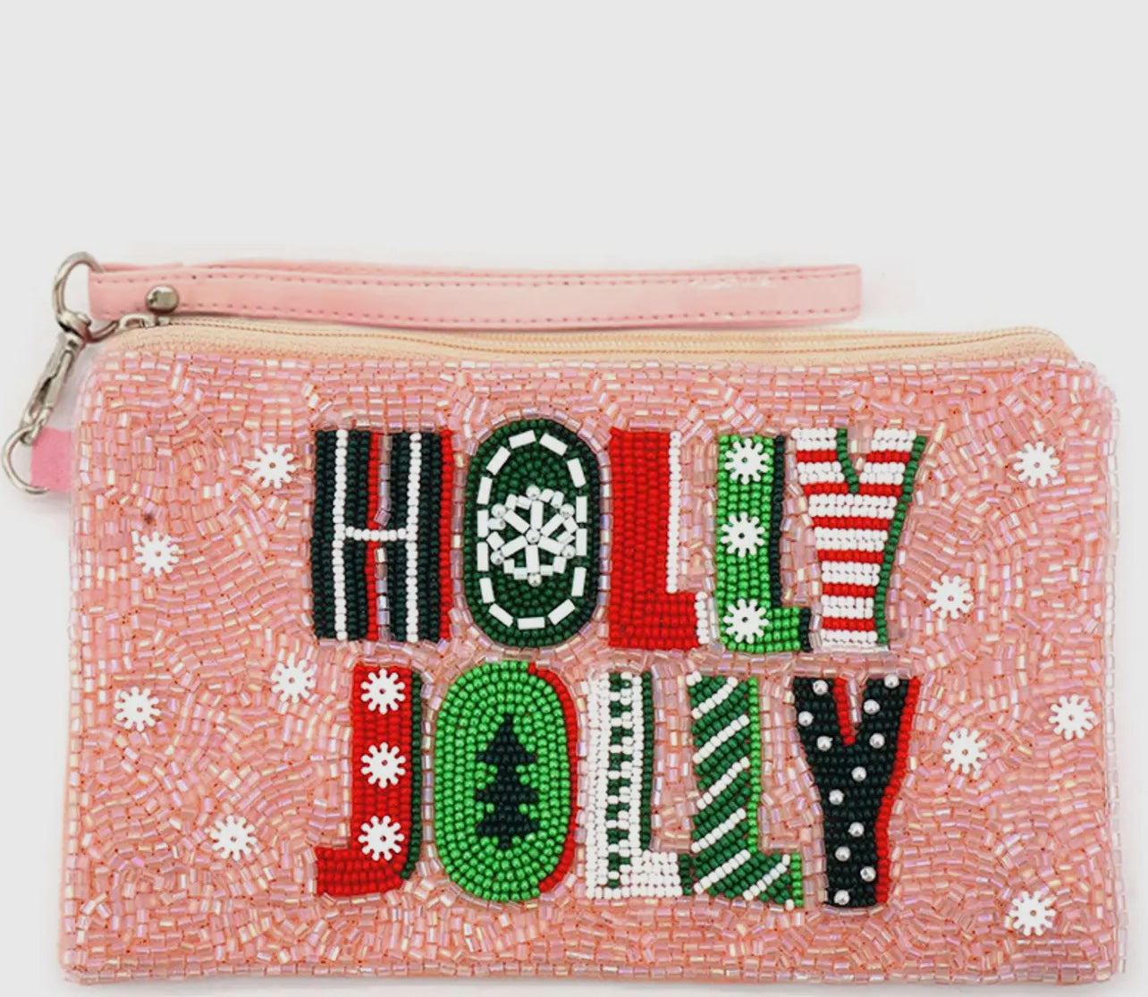 This baby pink beaded wristlet is the perfect accessory to add a touch of holiday cheer to your outfit. The playful "Holly Jolly" message is spelled out in vibrant Christmas-colored beads, adding a festive pop against the soft pink background. With its compact size and wrist strap, it’s ideal for carrying your essentials while spreading some holiday joy. Whether you’re attending a holiday party or just getting into the seasonal spirit, this wristlet brings a fun and festive flair to your look.
